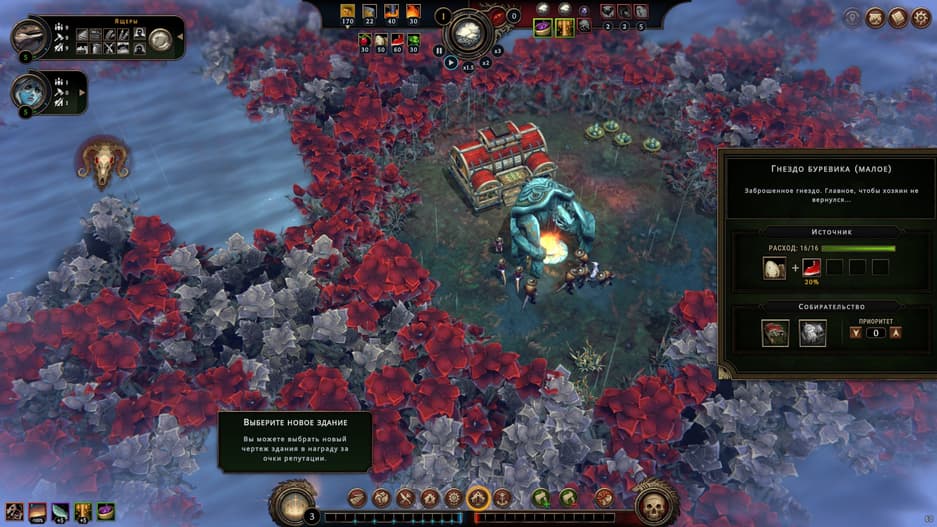 Сначала возводятся базовые сооружения, к которым прикрепляются несколько работников: лагерь дровосеков и лагеря для получения базовых ресурсов: камня, растений, грибов, мяса, насекомых, ягод, руды. У построек есть определённый радиус сбора, но большинство можно переставлять, когда область опустеет. Часть добычи съедобна, какая-то послужит при изготовлении более сложных материалов или пригодится в торговле.