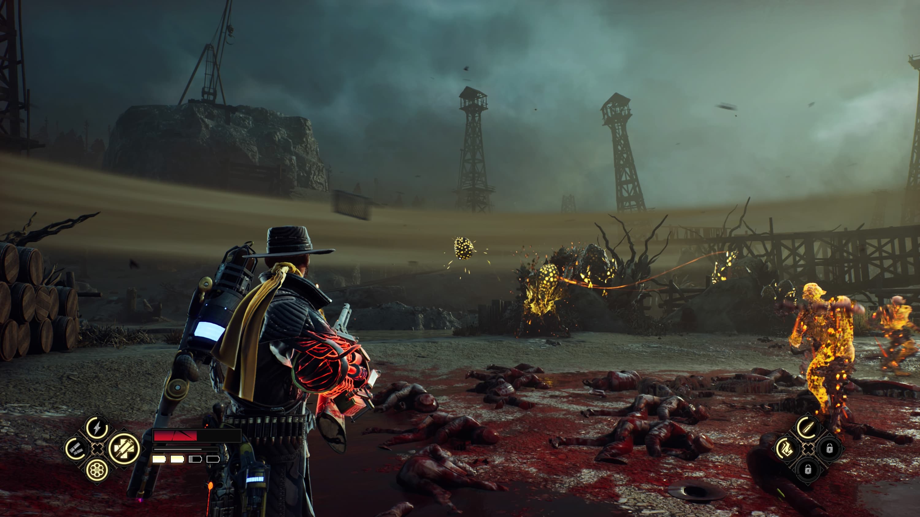 Но вот приближается мини-босс, атаки которого придётся не только парировать, но и успевать отстреливать из винтовки — это их прервёт и даст окно для наступления. Ящики с динамитом взрываются от попаданий и уносят нечисть обратно в адские пучины. Мини-босс оглушён электричеством и главный герой начинает добивающее комбо — удары наносятся быстрее и быстрее, разгон атаки продолжается без остановки. БУМ! Пошла анимация добивания, очередная нечисть отправилась в ад. На фоне слышен выстрел и победный «дзинь!», знаменующий финал сражения — ты справился с очередной волной, адреналин льётся по венам, сердце бьётся быстрее.