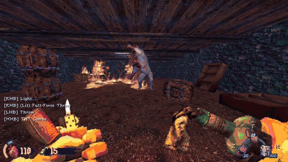 Динамит в игре работает, как вы и можете себе представить — поджигаешь и бросаешь во врагов. Но на этом веселье только начинается! Взрывчатку можно бросить, чтобы взорвать её точным выстрелом. Связку можно разделить, и закидывать культистов отдельными шашками, что увеличит радиус взрыва. Или объединить с Коктейлем Молотова! Или пнуть после броска, что позволит забросить динами ещё дальше! Игроку не нужен гранатомет. Он и есть гранатомет!