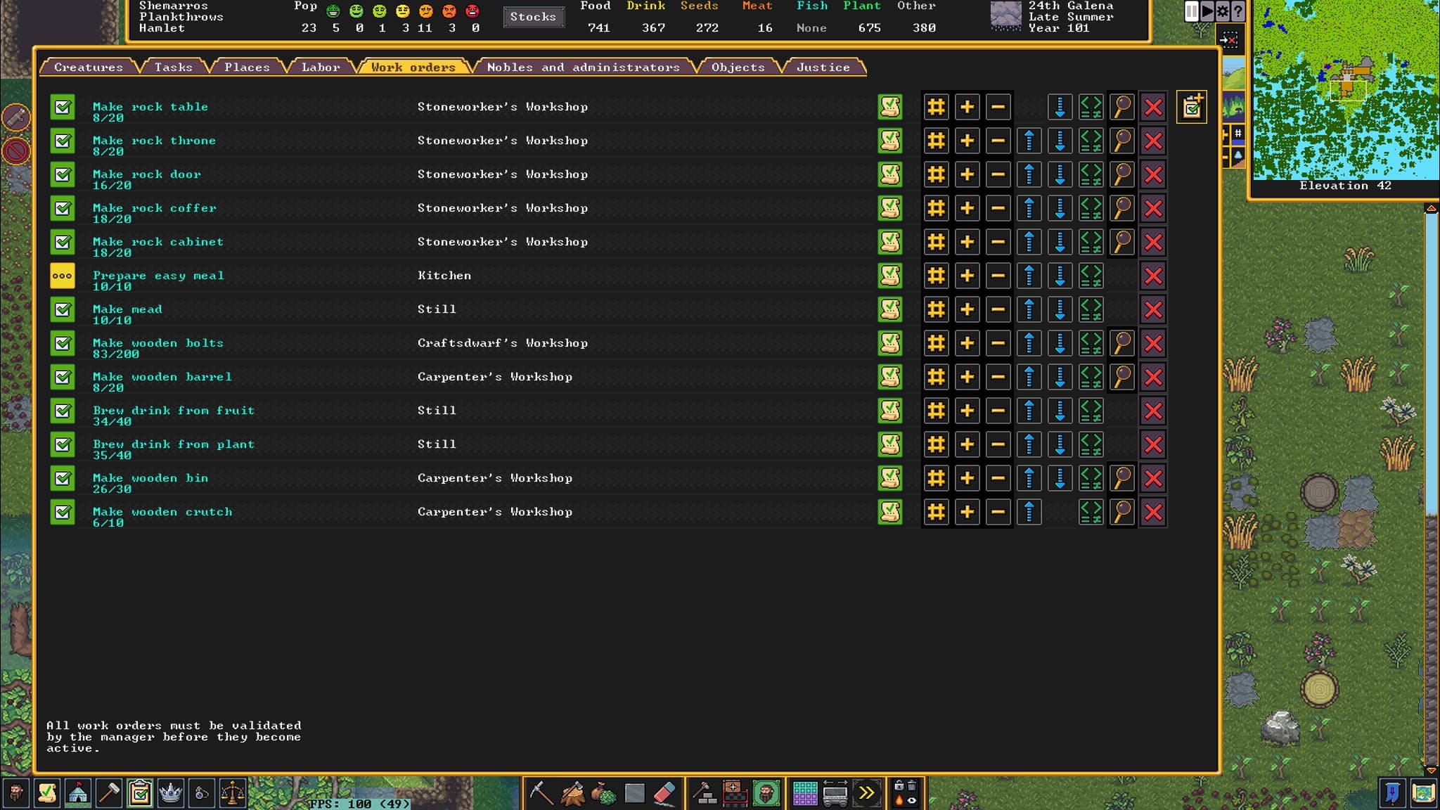 Дварфы обожают комфорт и удобство. И, само собой, каждый житель захочет получить отдельную обустроенную комнату. Для этого в мастерских организуется производство мебели, орудий труда, бытовых вещей. Какое-то добро пригодится для торговли с блуждающими предпринимателями или соседями.