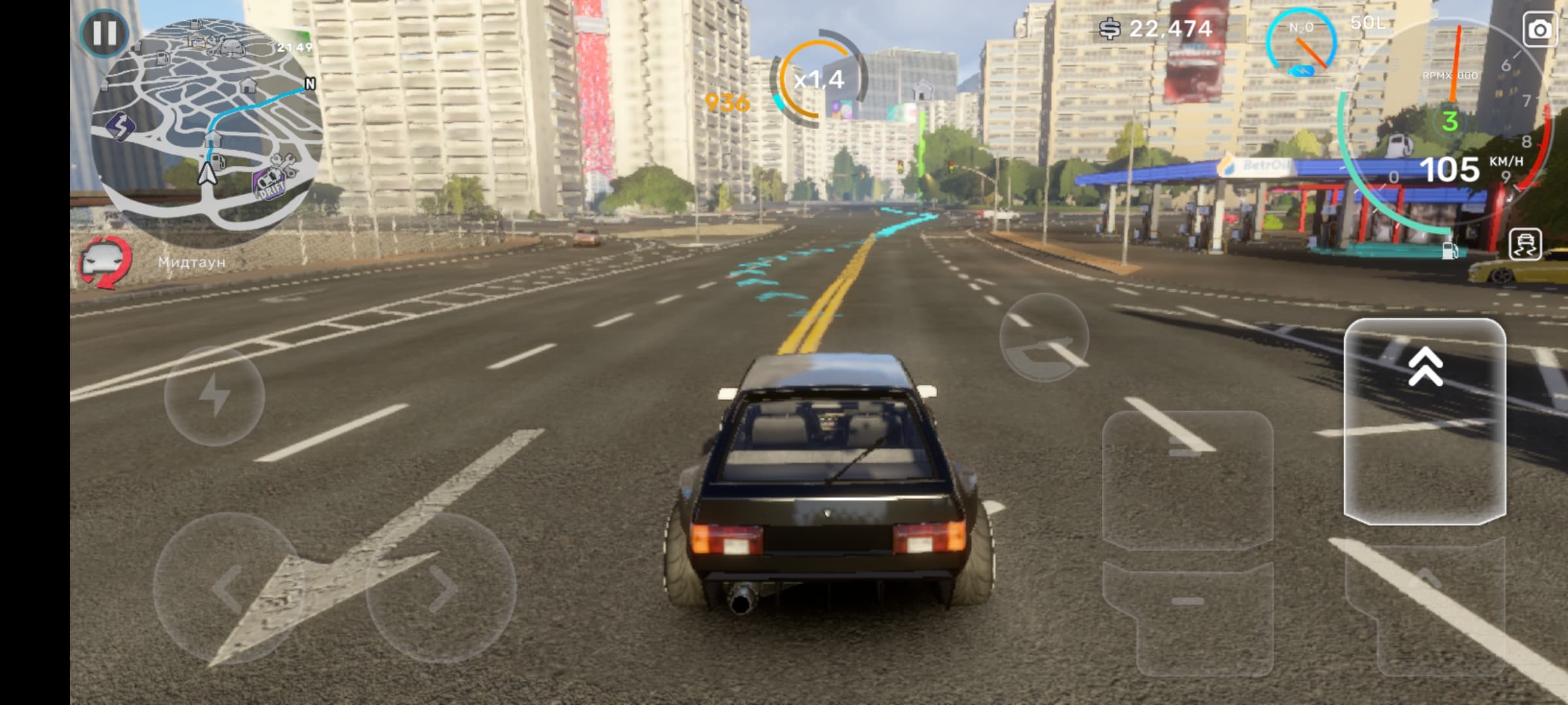 Как уже говорилось, гонки с ботами или живыми игроками в CarX Street отличные. Управление реализовано на зависть некоторым аркадным симуляторам на ПК. Два режима газа, аналогично реализованные два режима тормоза, отдельная кнопка ручника для дрифта, возможность управлять поворотом кнопками либо наклоном смартфона.