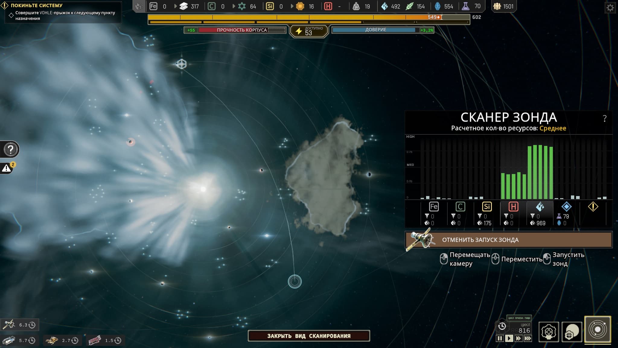 Интерфейс интуитивно понятен и справляется с предоставлением информации. Есть горячие клавиши, мини-карта, необходимые датчики, но большее внимание стоило уделить Сканеру Зонда, так как нередки случайные запуски.