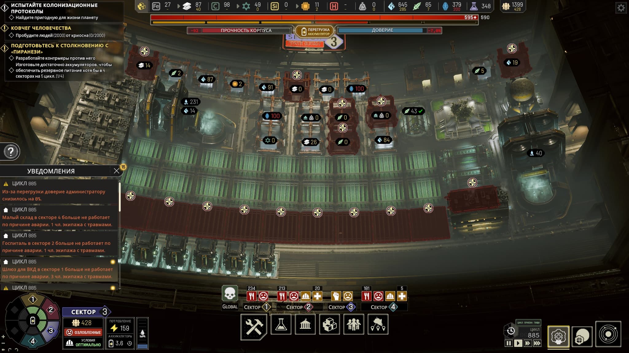 Основной же ресурс – рабочая сила, которая не увеличивается естественным способом, а добывается. Целомудрие вредит «Тиккуну» и способ получения рабочих рук один – обнаружить криокапсулы с выжившими, разморозить в криоцентре и только после этого понять будет ли новый житель Рабочим или Неработающим, то есть обузой. В отсутствие нужного количества людей в секторе начнутся поломки и забастовки – вестники коллапса.