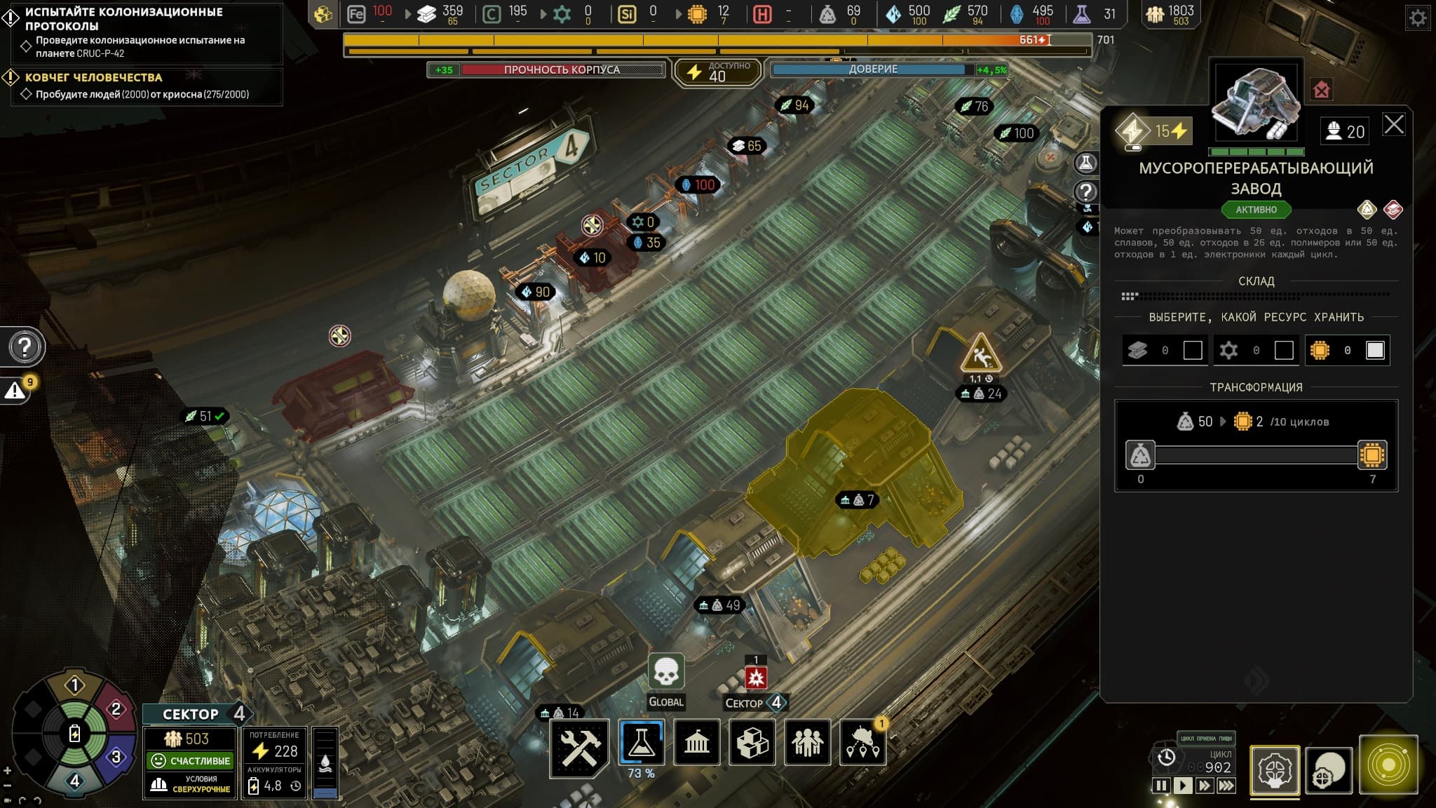 Игра начнётся в «Секторе 1» станции, условном «стакане», состоящем из клеточек, где, как и в тетрисе размещаются «фигуры»-здания. Всего таких «Секторов» по мере развития откроется шесть. Каждый – миниатюрный город, где целесообразно установление специализации – космос, промышленность, пища и другие, так как это даст дополнительные бонусы. Желательно сразу понять, что и как ставить, семь раз отмерить, ведь дальше будет не до редизайна. А правильно всё посчитать почти нереально – здания сносить можно, но это вызовет массу неприятностей.