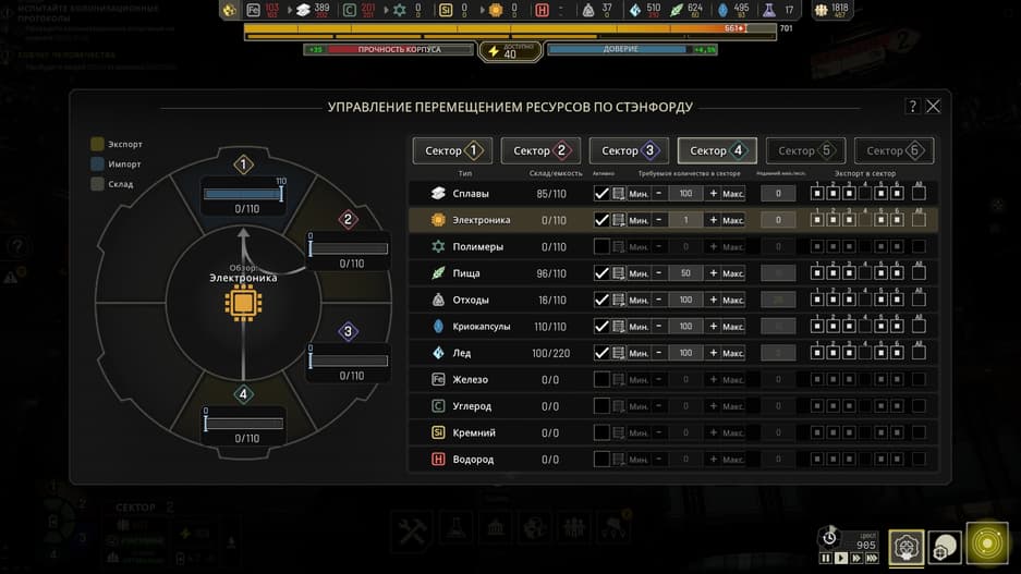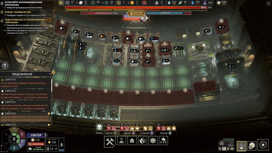 Необходимо внимательно контролировать состояние каждого из шести секторов и вручную перебрасывать население и в полуавтоматическом режиме недостающие ресурсы. Такой микроменеджмент неизбежно приведёт к ошибке или забывчивости, а так как автосохранений здесь нет – иногда придётся переигрывать и сотни внутриигровых циклов, на которые тратятся часы.