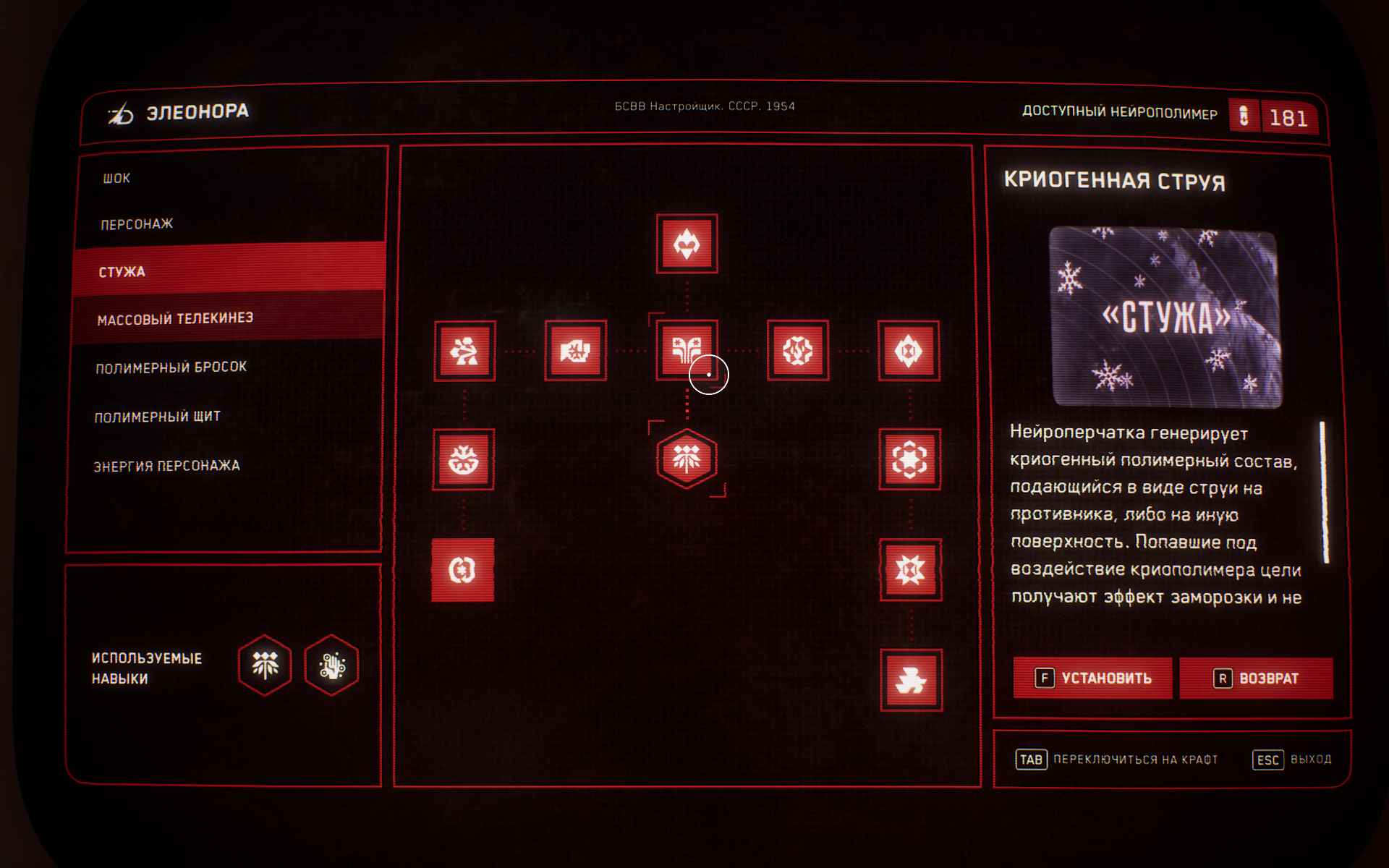 В последнем помогают и способности перчатки ХРАЗ. Установить позволено только две за раз, а менять их можно в оружейном шкафчике «Элеанора». Шок, Стужа, Массовый телекинез, Полимерная струя, Полимерный щит — активных навыков пять и все полезны.