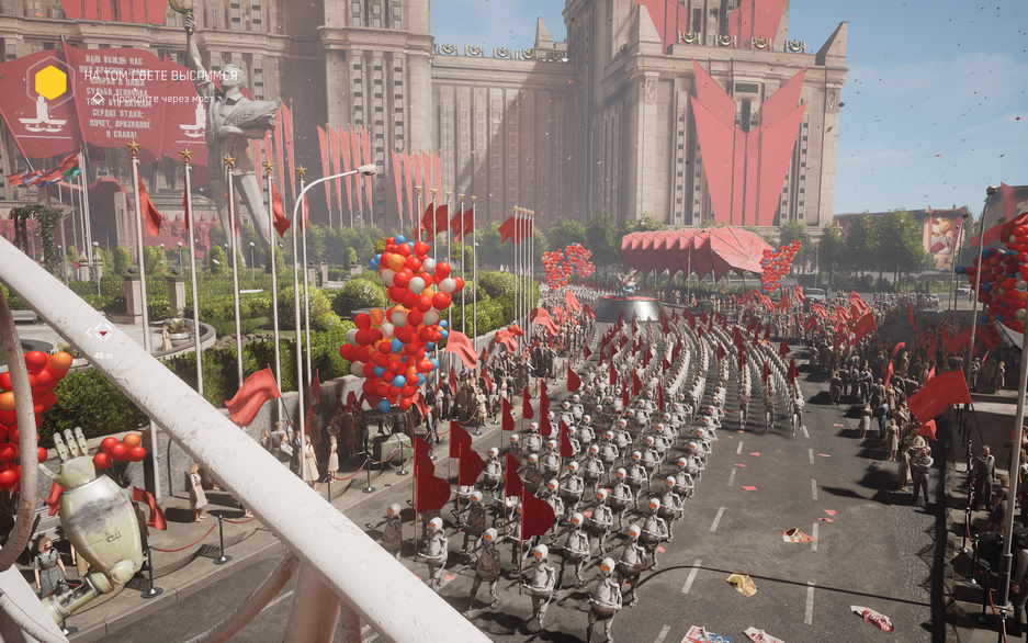 Каждый уголок мира Atomic Heart наполнен кучей отсылок и советской эстетикой. В комнатах сохранения по телевизору идёт «Ну, погоди!», из громкоговорителей играют хиты советской или российской эстрады — «Остров невезения», «Сэра», «Перемен», «Комарово» — хочется иногда остановиться и наслаждаться атмосферой. Если чужда советские эстетика и эпоха — скорее всего, игра не понравится так сильно, как могла бы.