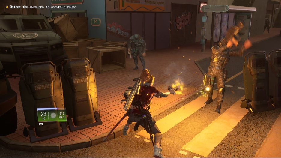 Удручает и стилистика игры. Это пресный и переусложненный салат: задорные 80-е и современное видение жанра киберпанк, эстетика боевиков класса «Б» из начала 90-х и японской анимешной дури. Четверка главных персонажей — классический «западный» вид футуристического отряда быстрого реагирования. Но главная героиня, Ханна Стоун, одарена непропорциональной головой по отношению к телу и огромными глазами. Разработчики так сильно хотели выделить героиню, что зачастую забывали анимировать зрачки — Ханна смотрит и не моргает.