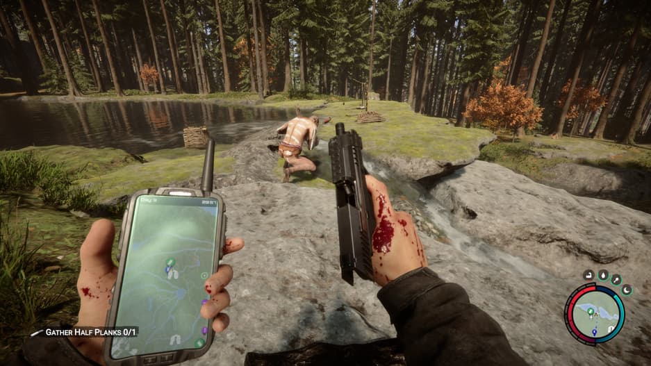 Против незваных гостей помогают стены с ловушками или частокол как первый этап защиты. Придётся созданное и найденное оружие против них использовать — пистолеты, арбалет, самодельный лук. Но самое приятное в использовании — дробовик. Выстрел буквально удаляет противника из жизни, отрывая конечности — если они вообще останутся после встречи с картечью. А если за гадом стоял еще кто — ему тоже достанется.