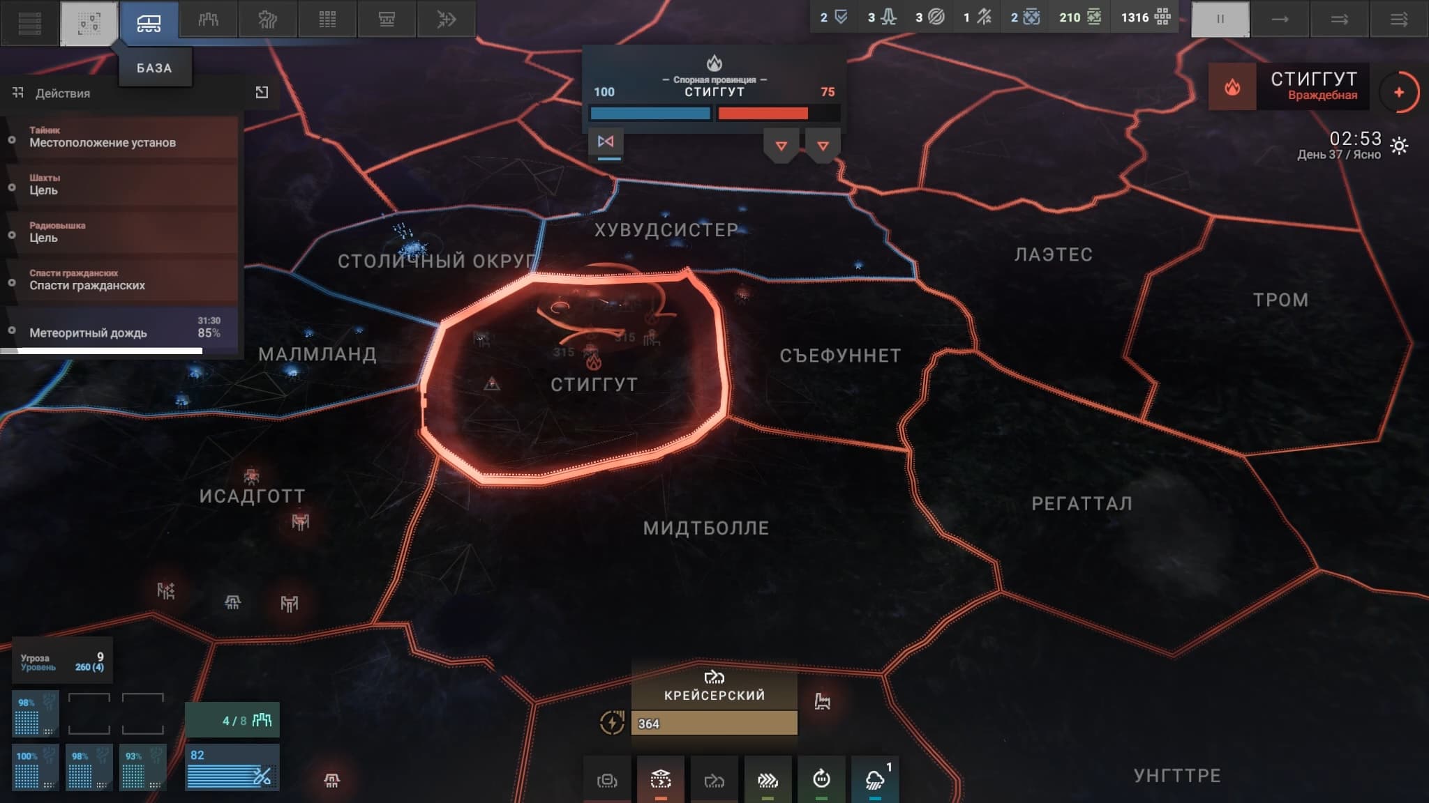 После непродолжительного вступления с обучением и серией заставок в игрока швыряют необъятную карту с десятками провинций, по которой на мобильной базе перемещается мужественная освободительная «Призрачная Бригада». Здесь ведётся управлением всем хозяйством: пилотами, мехами, мастерской и улучшениями. База постепенно будет пополняться ресурсами, необходимыми для ремонтов и апгрейдов.