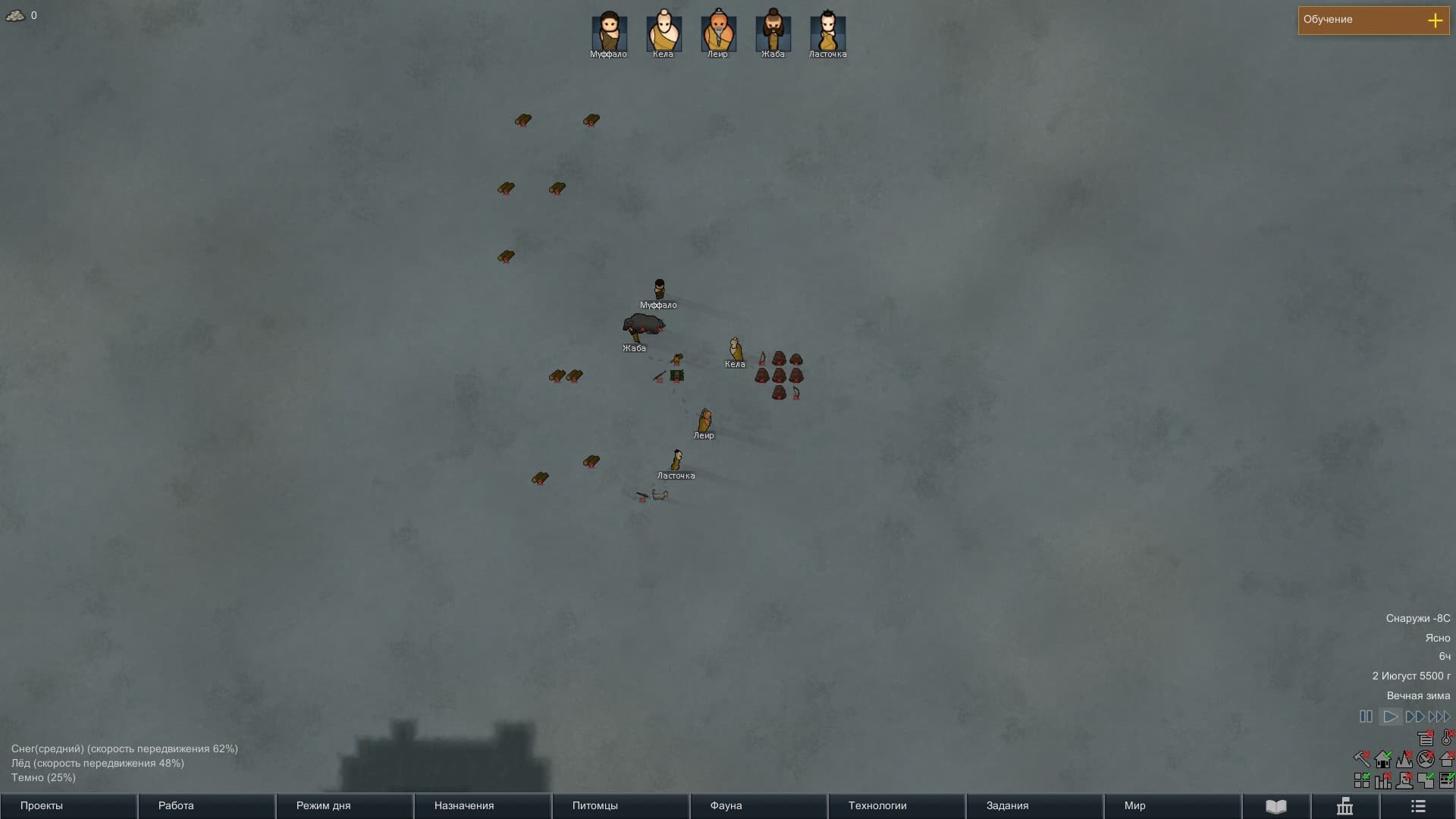 Колонисты начинают новую жизнь на голой земле. Ресурсов, доступных на старте, хватит на первое время, но потом уже придется обеспечивать колонию своими силами. Жители могут охотиться и выращивать растения для пропитания. Шкуры животных пойдут на новую одежду, а добытое дерево и полезные ископаемые пригодятся в строительстве. На успех этих действий влияют характеристики колонистов. Чем они выше — тем лучше и быстрее результат. Но важен и элемент случайности: растения может поразить болезнь или животное рядом с колонией сойдет с ума и отправится мстить за погибших собратьев нерадивому охотнику. Готовым нужно быть ко всему!