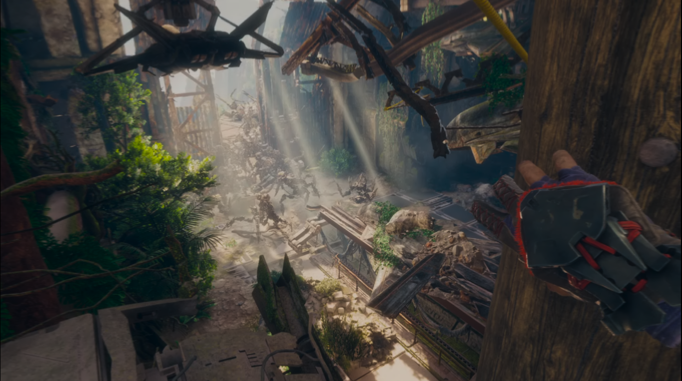 В отличие от похожей VR-игры от компании Crytek — The Climb — в Horizon VR нет никакой системы усталости или шаткости конструкций. Игрок может полчаса провисеть на одной руке на тоненькой балочке. Ни с ним, ни с балкой ничего не случится — сорваться вниз почти невозможно. Единственная сложность, которая настигает при восхождении или преодолении препятствий — это связки. Сначала надо вскарабкаться на гору, воткнуть гарпун, пустить канат по диагонали, проехаться на нем, достать в полете крюк-кошку, зацепиться за кольцо. И аки Тарзан перелететь пропасть и вонзиться в скалу, успев выбрать кирки.
