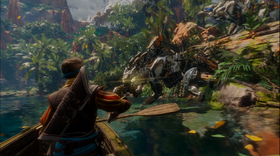 Система боя сделана превосходно — к каждому типу роботов нужен подход. На вооружении игрока есть лук с шестью типами стрел, материалы для создания которых разбросаны по миру. Само создание стрел — увлекательная мини-игра. Возьми палочку, прикрепи перья, надень наконечник, к наконечнику прикрепи заряд и вот у игрока шесть стрел с огнежаром. В паре с луком игроку дают взрыв-пращу с тремя типами снарядов, которые тоже активно используются в бою для выявления слабых мест у оппонентов.