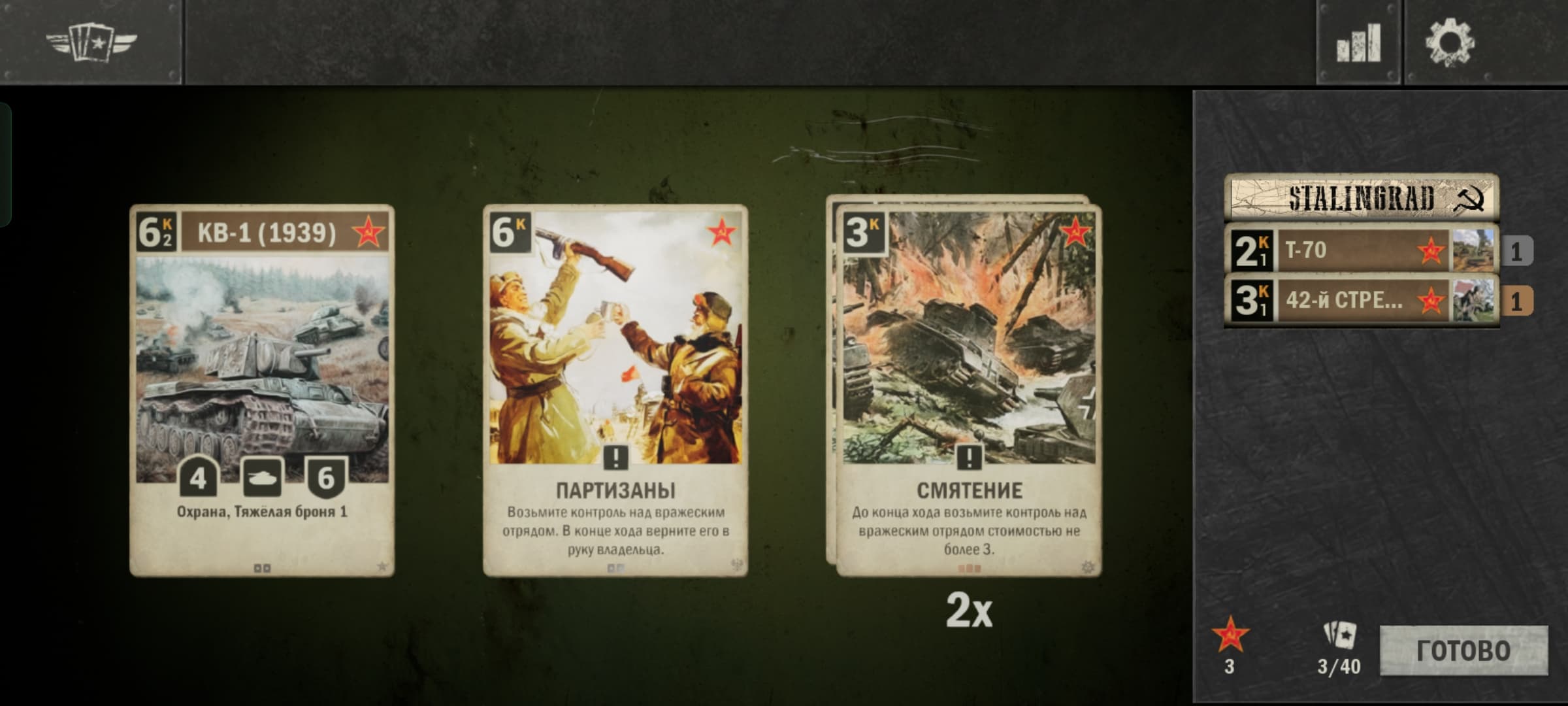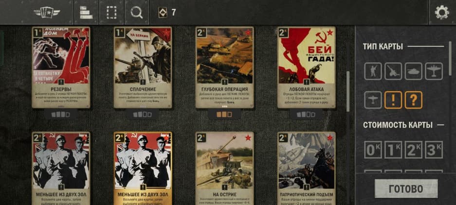 Карточки имеют три вида: подразделения, приказы и контрмеры.