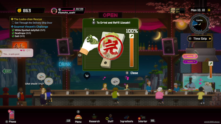 Как и в Moonlighter – все собранные ресурсы пойдут в дело. В суши-баре Банчо приготовит и улучшит пойманную рыбешку. На улучшение тратится рыба, а взамен повышается вкус и цена блюда. Оставьте немного и для клиентов, но не нужно вываливать все – время на открытие ресторана ограничено.