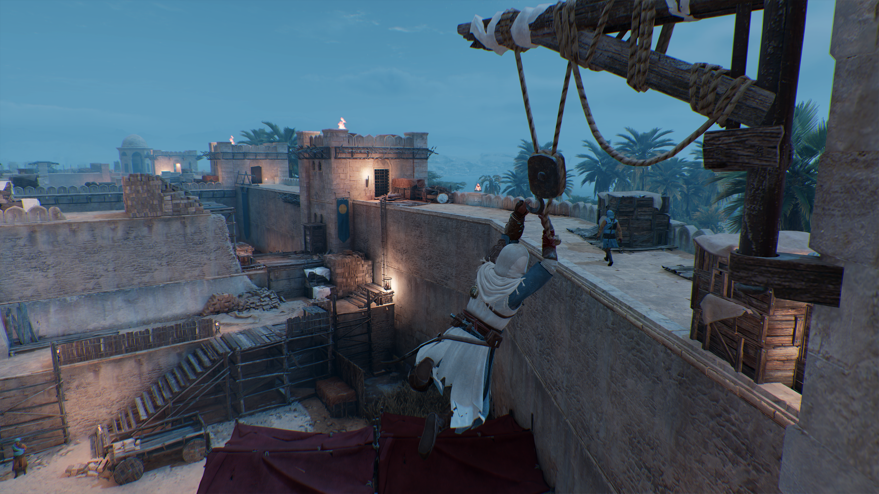 Увы, паркуру в Mirage далеко до великолепия из Assassin’s Creed Unity, но его доработали по сравнению с «Вальгаллой». Плотность домов, мостиков, тросов, балок — это позволяет пробежать из одной точки в другую ни разу не ступив на землю. Пусть паркур и двухнопочный, но теперь лазать по любой отвесной скале или гладкой стене не выйдет — нужно искать выступы, прыгать на торчащие по сторонам балки или уступы, продумывать маршрут. Анимации тоже сделали мягкими — чувствуется ловкость Басима, которой не было у Эйвор из «Вальгаллы».