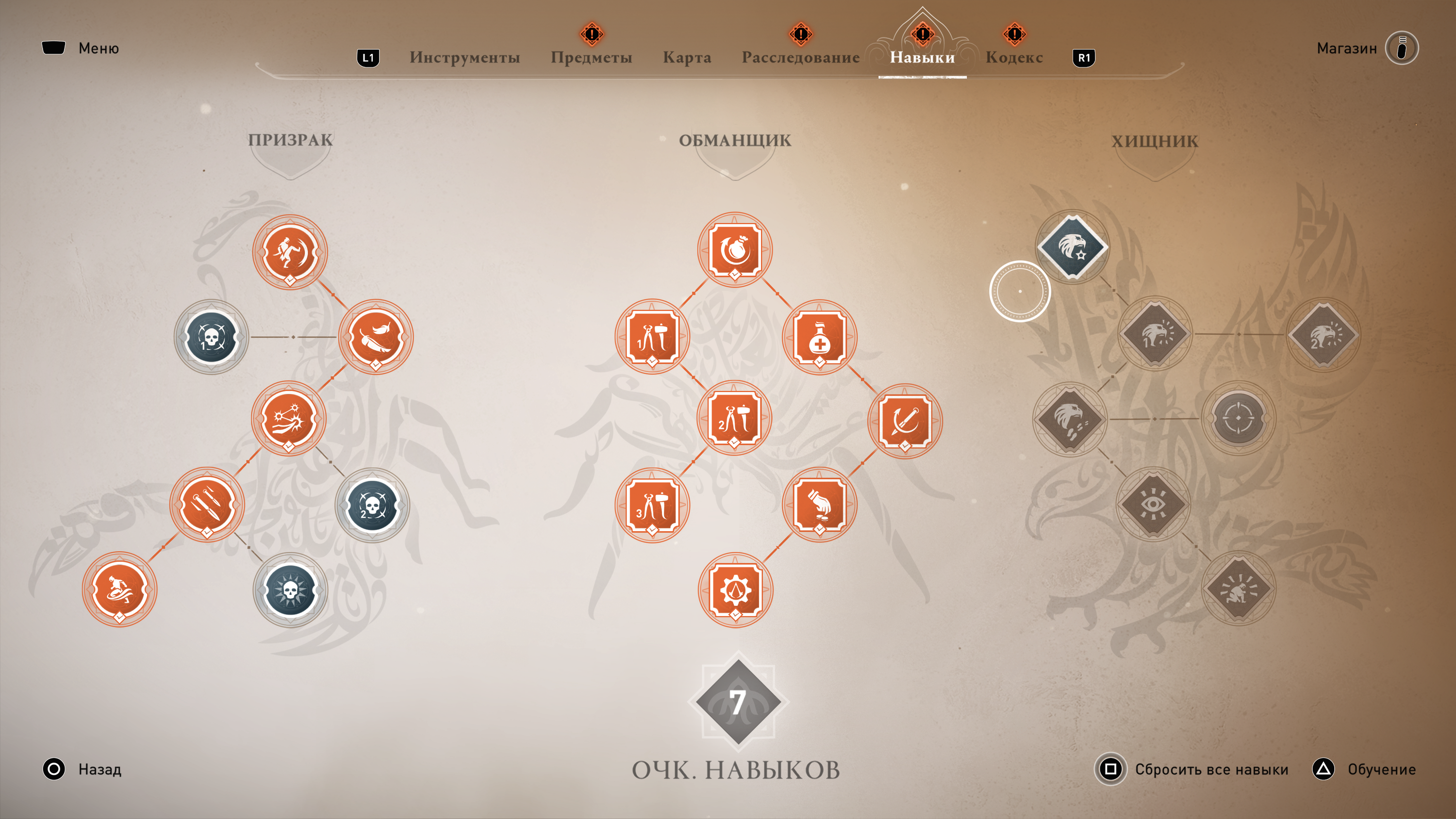 Инструменты Басима — метательные ножи и усыпляющие дротики, дымовые и шумовые бомбы, несмертельная ловушка — помогают как в открытом бою, так и во время стелса. Их прокачка важна, особенно если вы играете на высоком уровне сложности, и куда полезнее, чем апгрейд снаряжения ассасина. Возможности отравлять метательным ножом, усыплять группу противников или лечиться в дыму бомбы — незаменимая помощь в любой задаче..