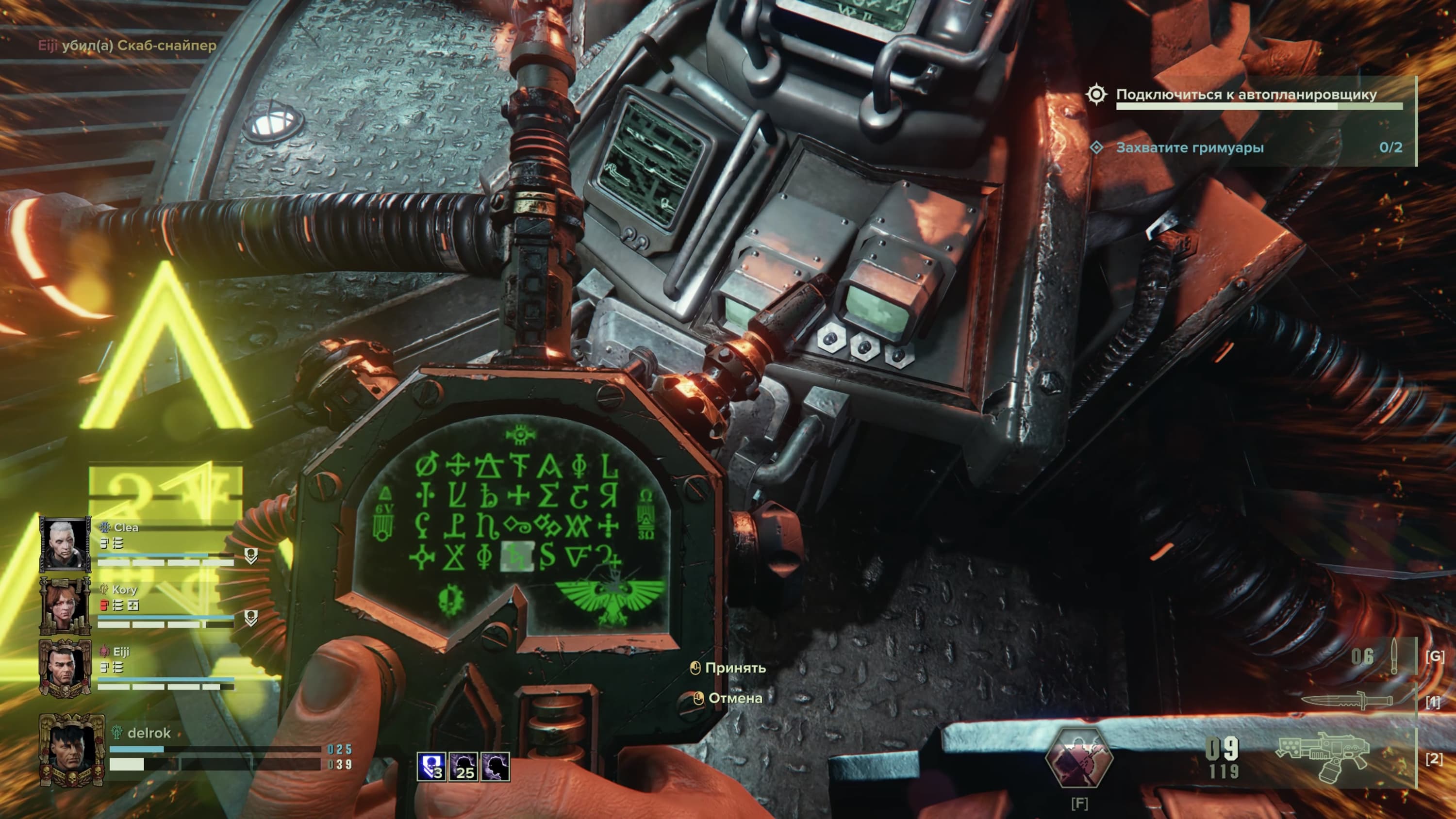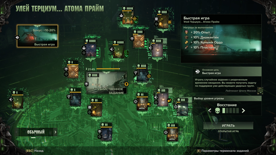 Когда всё готово, игроку предлагают ознакомиться с заданиями, почитав цель и обоснование забега, выбрать сложность и модификаторы, влияющие на награды. Сюжет в игре сделан для галочки, каждые пару уровней напоминает о себе постановочными сценами, и по достижении 30 уровня завершится, что разочаровывает. Забавно, что за него отвечал Дэн Абнетт — патриарх и автор почти пяти десятка книг по вселенной (циклы «Инквизитор Эйзенхорн», «Ересь Хоруса»)!