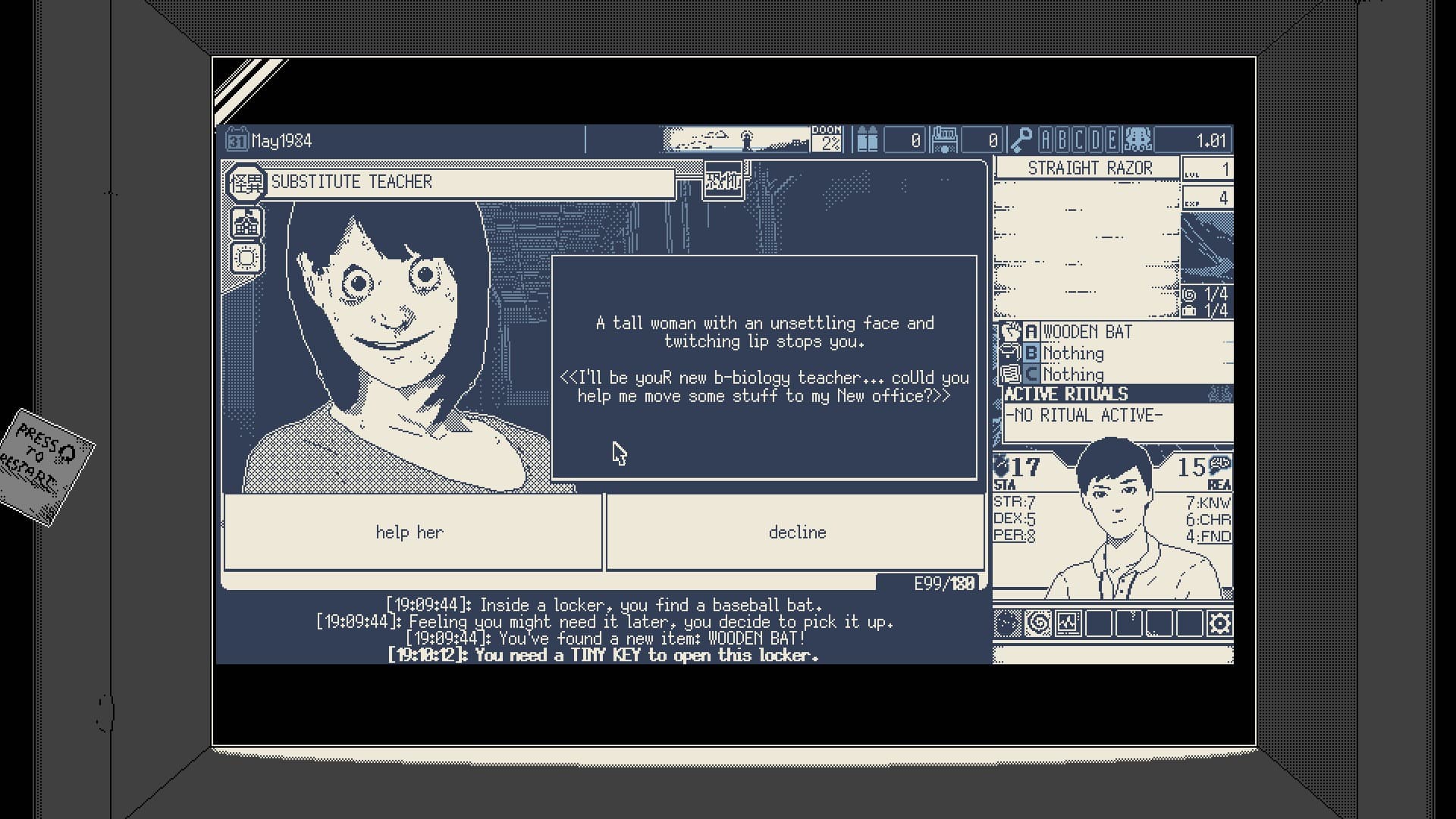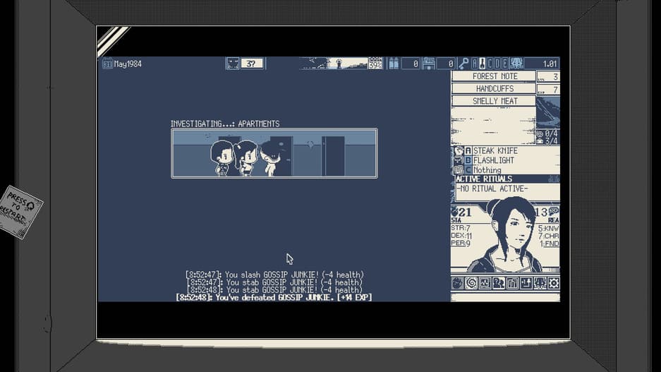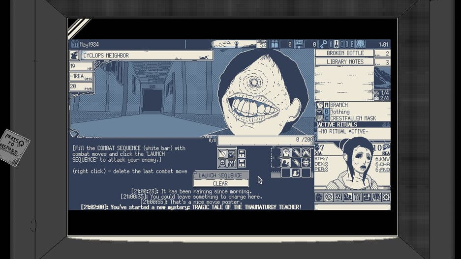 Стоит понимать, что World of Horror не о борьбе с монстрами — это симулятор распределения ресурсов. Спрашивайте себя: «Готов ли я к очередной драке? Могу ли рискнуть?». Придётся расследовать тайны так, чтобы разум и стойкость не достигли 0, а счетчик рока – 100%. Это значит, что иногда придется пожертвовать людьми, чтобы предотвратить конец света — такова цена.