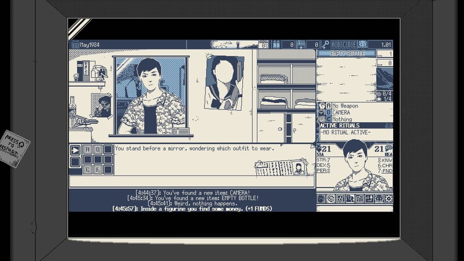 А ещё по началу создаётся впечатление, что World of Horror не страшная. Ну как может напугать однобитная черно-белая игра? Может! Проект отчётливо передает ощущение загнанности: за каждым углом поджидает опасность, принятые решения влияют на здоровье героя и его внешность, со временем начинают чудиться монстры — персонаж сходит с ума перед лицом конца света. Атмосферу дополняют жуткие анимация и музыка.