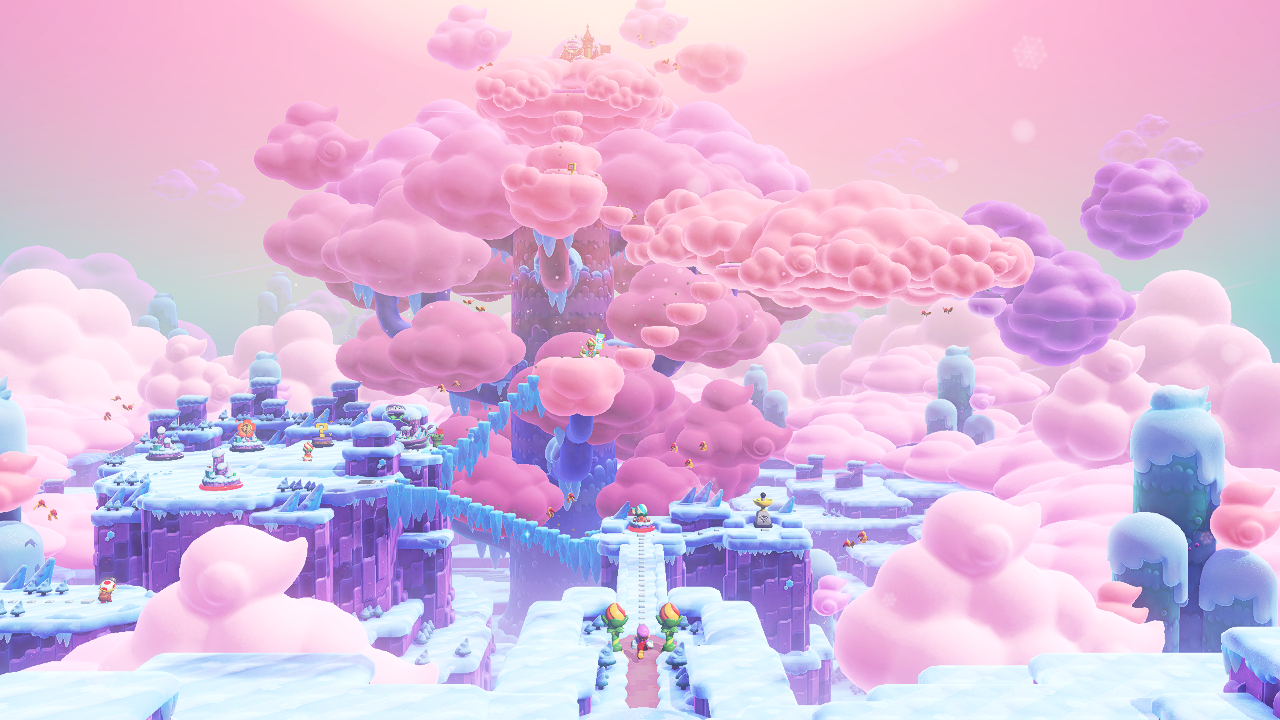 Но то ли ещё будет! В первом же мире Марио и его команда, между членами которой можно переключаться — брат Луиджи, принцессы Пич и Дейзи, грибные человечки Тоады и Тоадетта, а также динозавры Йоши — находят новый способ ловить «приходы». Волшебный шарик, который превращает всех героев, кроме динозавров, в… Слонов! Больших существ, которые могут набирать в хобот воду и опрыскивать врагов, а также цветочки — последние дают монетки и различные бонусы. Остаётся только представлять, как разработчики вообще дошли до подобных механик.
