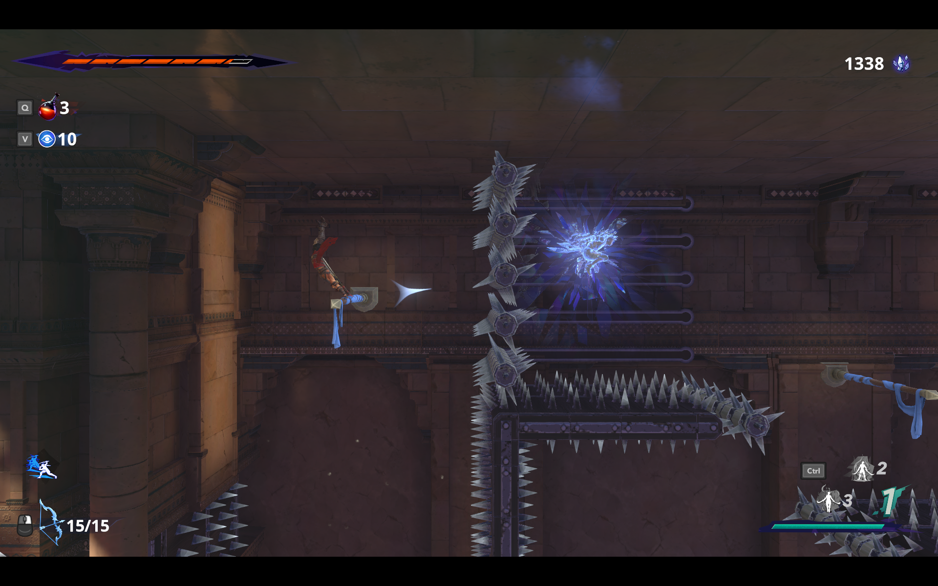Только в отличие от Hollow Knight и Metroid Dread, «Принц» не только заставляет использовать эти способности в определённых местах для преодоления одного препятствия и открытия новых областей, но и прямо во время прохождения. Паркур между сталагмитами и сталактитами, где придётся использовать двойной прыжок, рывок, отпрыгивания от стен, притягивания к специальным точками — в The Lost Crown это норма. В какой-то момент игра начала напоминать мне I Wanna be the Boshy — под финал приходилось точно и без ошибок проходить паркурные секции длинной в несколько минут без передышек — настолько здесь зубодробительный платформинг!