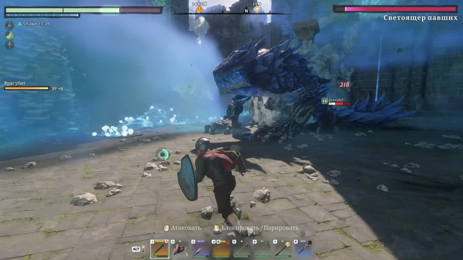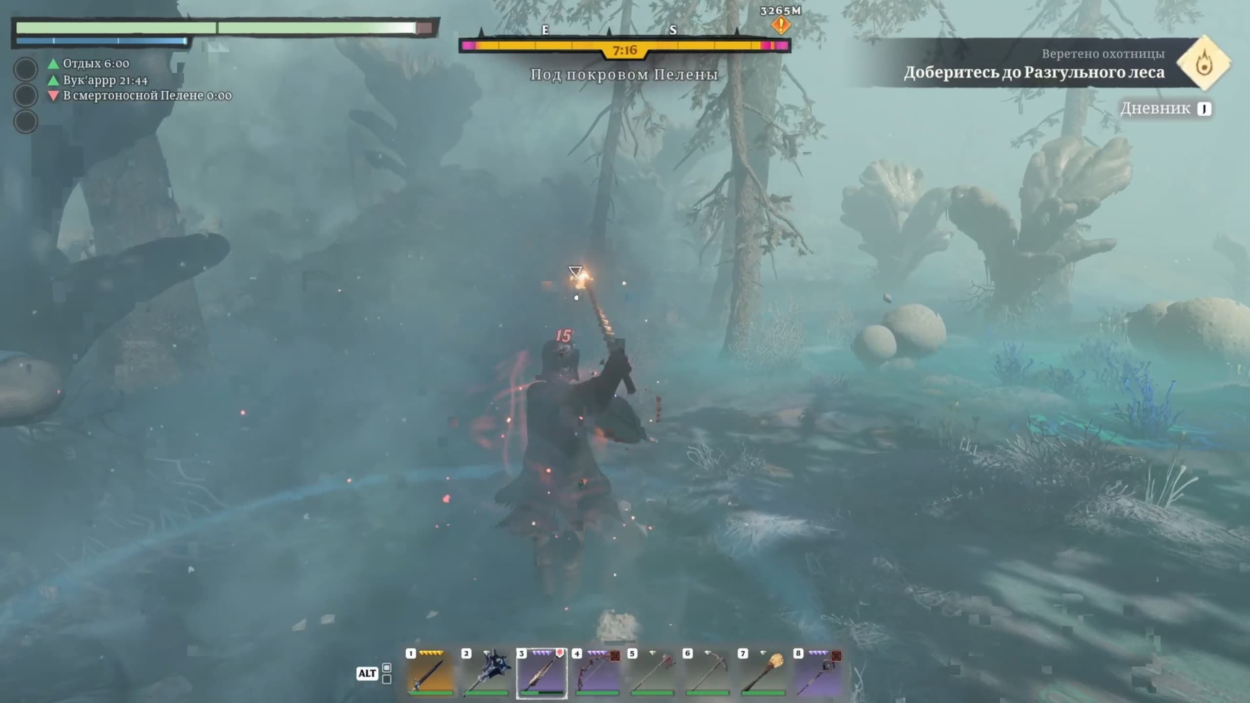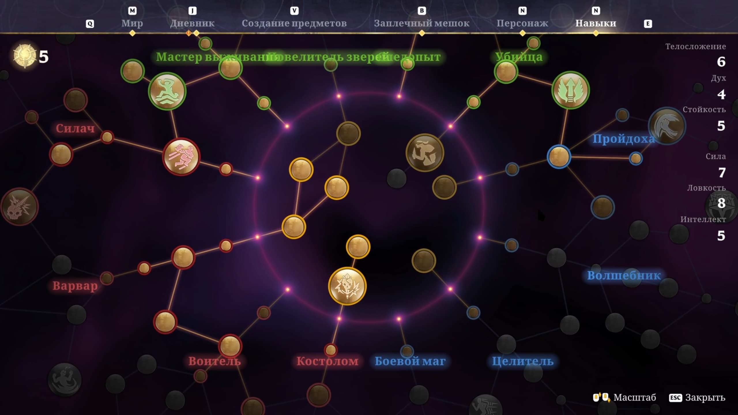 Стремление к комфорту – малая часть игры. Намного важней исследование безжалостного мира, для чего потребуется оружие. И есть из чего выбрать: мечи, дубины, луки, жезлы и посохи. Можно не спешить определяться с выбором класса, которых здесь двенадцать, а лучше почитать способности в древе развития — более скромном аналоге из Path of Exile. Например, было бы разумно изучить сверхполезный «Двойной прыжок». Вообще «перекачаться», перевыбрав навыки, в Enshrouded проще простого – понадобится валюта «Руны», щедро разбрасываемая противниками.