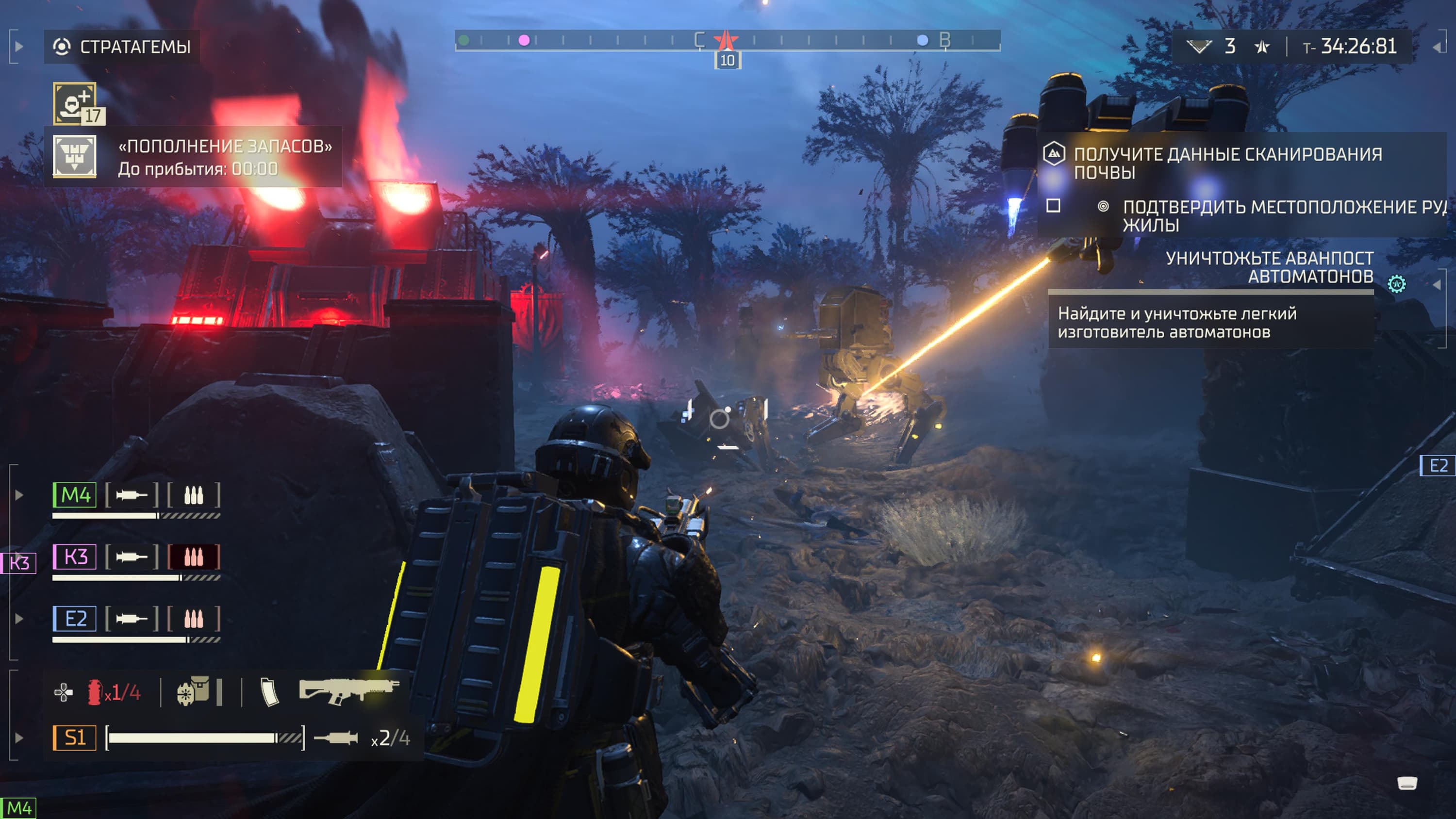 Вместе с основным оружием в бой можно также взять второстепенное, а затем призвать его при помощи стратагемы. Какого-то универсального выбора игра не предоставляет, заставляя подстраиваться чуть ли не под каждое задание индивидуально. Скажем, если в ходе миссии придется столкнуться с бронированными целями, то лучше взять безоткатное ружье или автопушку, когда для расправы над группами врагов подойдет дуговой метатель, стреляющий скачущей между врагами молнией. К слову, о врагах.