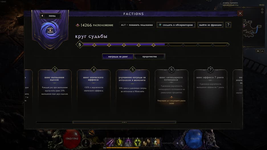 В первом сезоне добавлена система фракций, упрощающая получение необходимых предметов. Круг Судьбы отвечает за шансы выпадения вещей с помощью специальных пророчеств, а Гильдия Торговцев даёт доступ к аукциону, где можно приобретать снаряжение, выставленное на продажу за золото другими игроками. Сами пророчества и возможность совершить покупку ограничены очками «расположения», получаемыми за убийства монстров. Понятно, что вторая фракция есть только в мультиплеере.