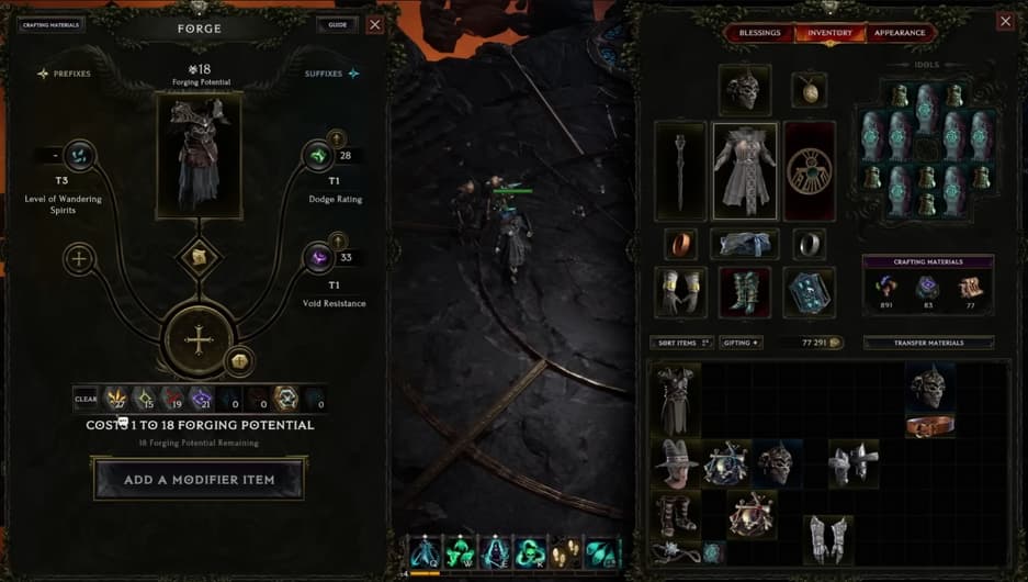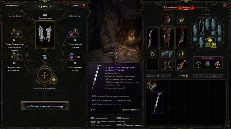 Стоит отметить систему ковки предметов в кузнице. Игрок может выполнять операции с аффиксами на предметах – удалять ненужные, улучшать, изменять, переносить. Но у всего есть определённая цена и ограничения. Любая операция расходует «потенциал ковки», а снаряжение с нулевым значением изменять нельзя. Всё завязано на использовании рун, глифов и осколков разной ценности.