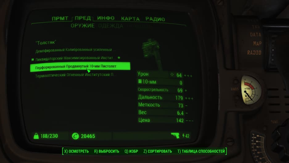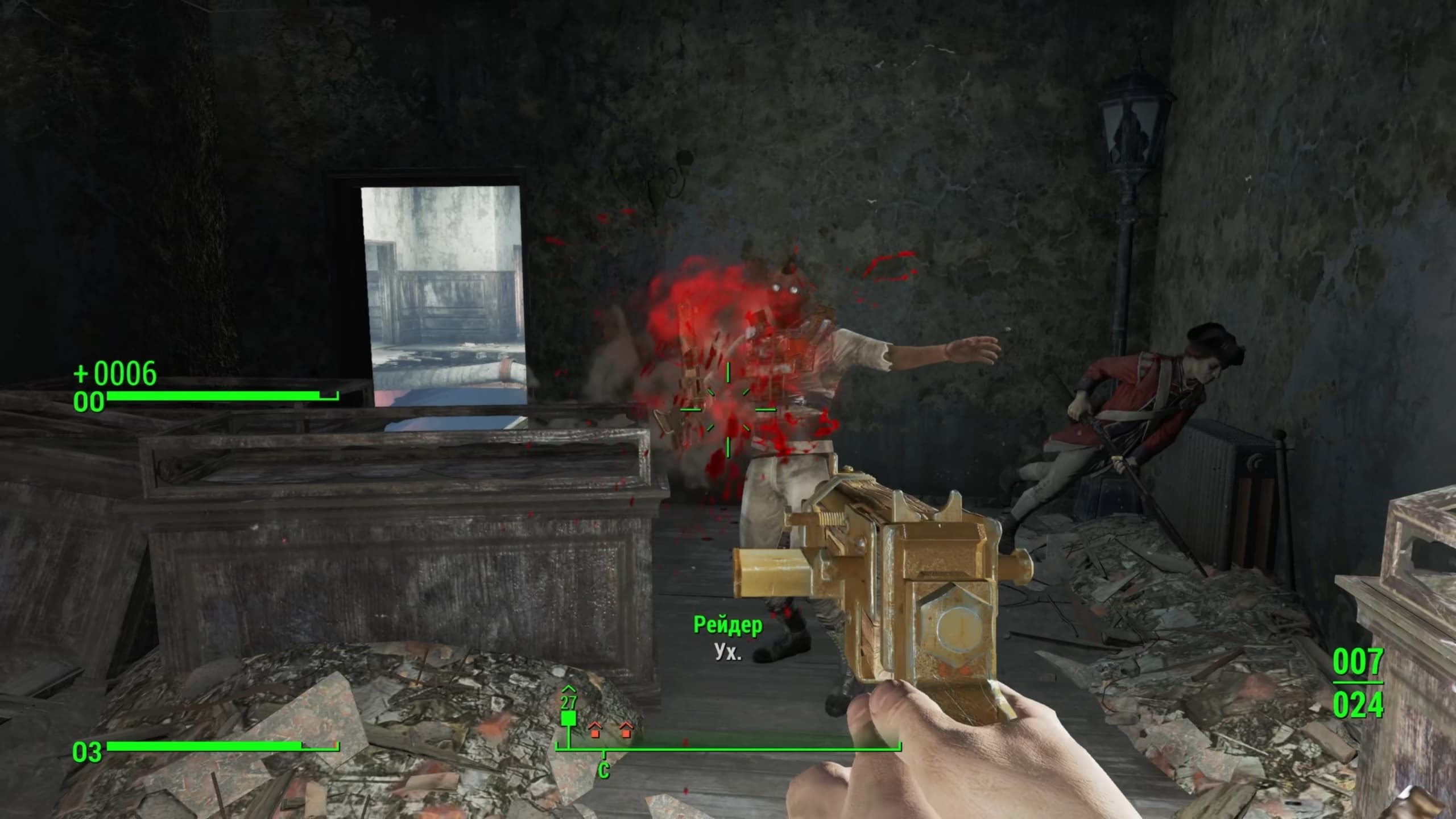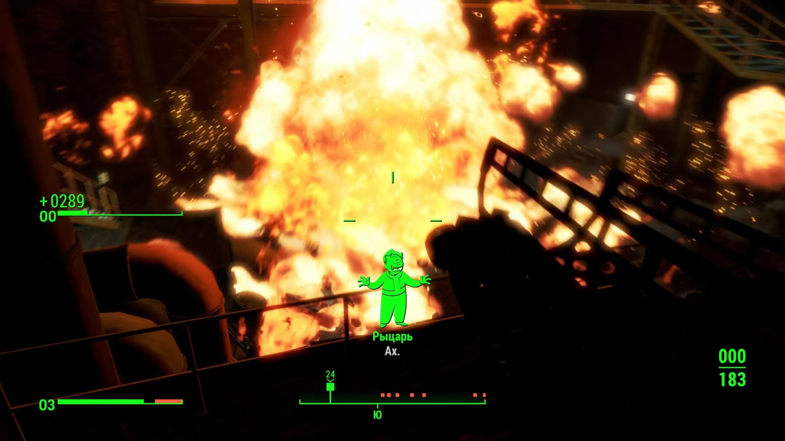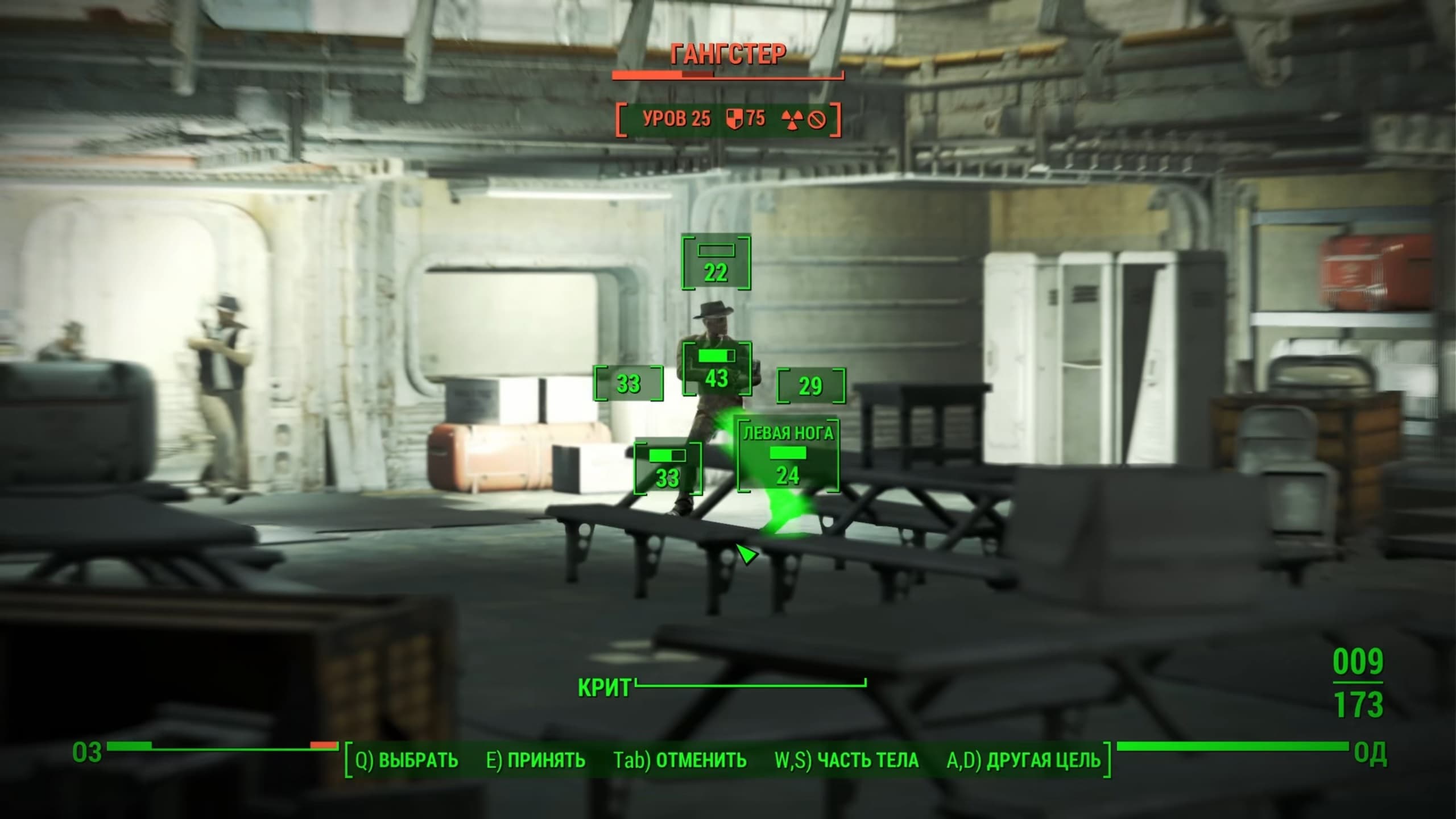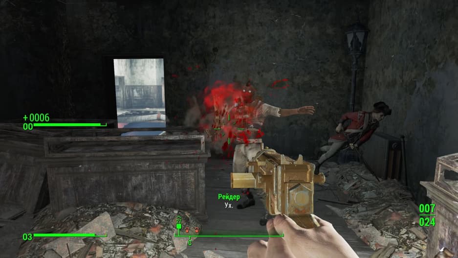 Стрельба – важная часть геймплея и впечатляет. В своё время Bethesda хвалилась, что «уроки шутинга» им давала сама id Software, разработчики DOOM. Оружие условно разделено на три группы: ближнее, физическое и энергетическое. Особо стоит отметить пошаговое прицеливание V.A.T.S., замедляющее время и позволяющее наносить урон по разным частям тела.