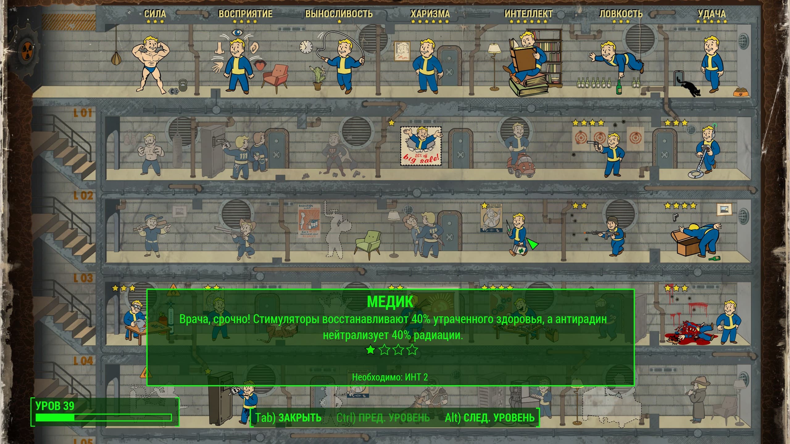 Внушительная система развития персонажа S.P.E.C.I.A.L. даёт свободу экспериментам: прокачка владения оружием, получения лута, создания лучших предметов, повышение живучести, адаптация к суровой среде и многое другое.