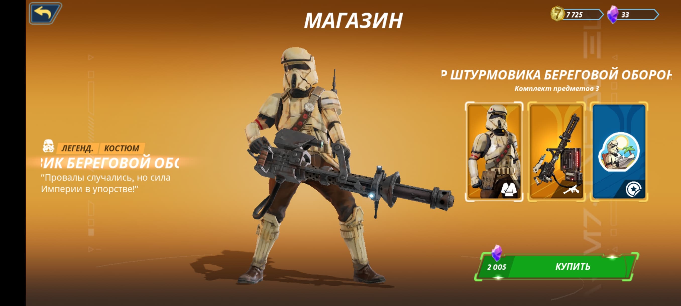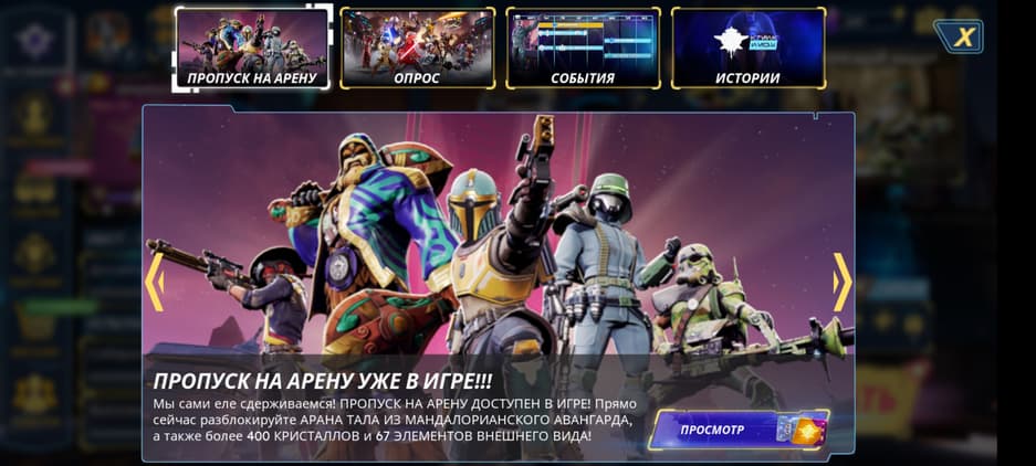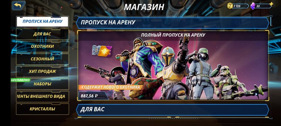 Не хочешь тратить время на разблокировку персонажа? Пожалуйста, приобрети его за 1000 кристаллов (10$). Получил немного опыта для открытия героя? «Смотри — скидка! Теперь ты можешь купить его всего за 800 алмазов...а теперь за 700...ну возьми, за 500 отдам! Ну пожалуйста-а!». Подобное может происходить после каждого матча. При этом за 9$ можно приобрести целый набор из персонажа и косметики к нему, но в меню персонажа об этом тактично умалчивают. «А ещё у нас есть боевой пропуск! В нём ты можешь получить нового героя — мандалорца Аран Тала! Торопись, пока он не пропал!».