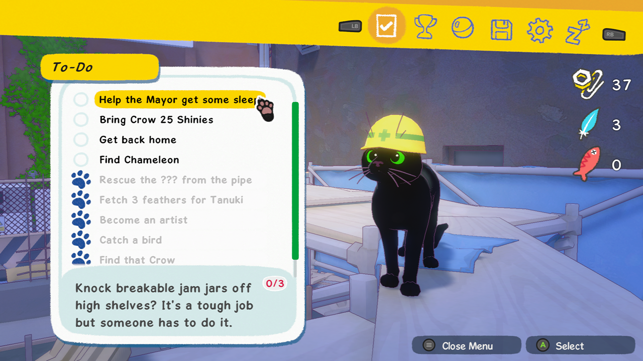 Небольшой набор развлечений дополняют возможность сталкивать предметы лапой с высоких мест, «рисовать» на бумаге — испачкавшись в краске или пробежав по свежезалитому бетону, — путаться у людей под ногами и тереться о них и привлекать к себе внимание мяукая. Есть также возможность понежиться в приятных любому коту местах или спрятаться в коробке. Жаль, что многие из этих механик не используются при решении головоломок или прохождении основного сюжетного квеста. Выполнять эти действия забавно, но наградой будет лишь единожды открытое достижение.