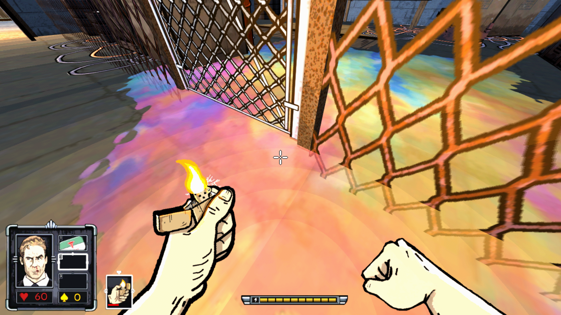 Однажды, я забрёл в комнатку с запертой решеткой, под которой разлит бензин. Сложив «два плюс два», решил, что можно поджечь эту лужицу. Как не пытался, не танцевал с зажигалкой в руке — полыхнула лишь моя пятая точка, а лужа бензина недоумённо продолжала растекаться по полу. Позже мне удалось найти иной вход в эту комнатку, но там не оказалось ничего полезного.