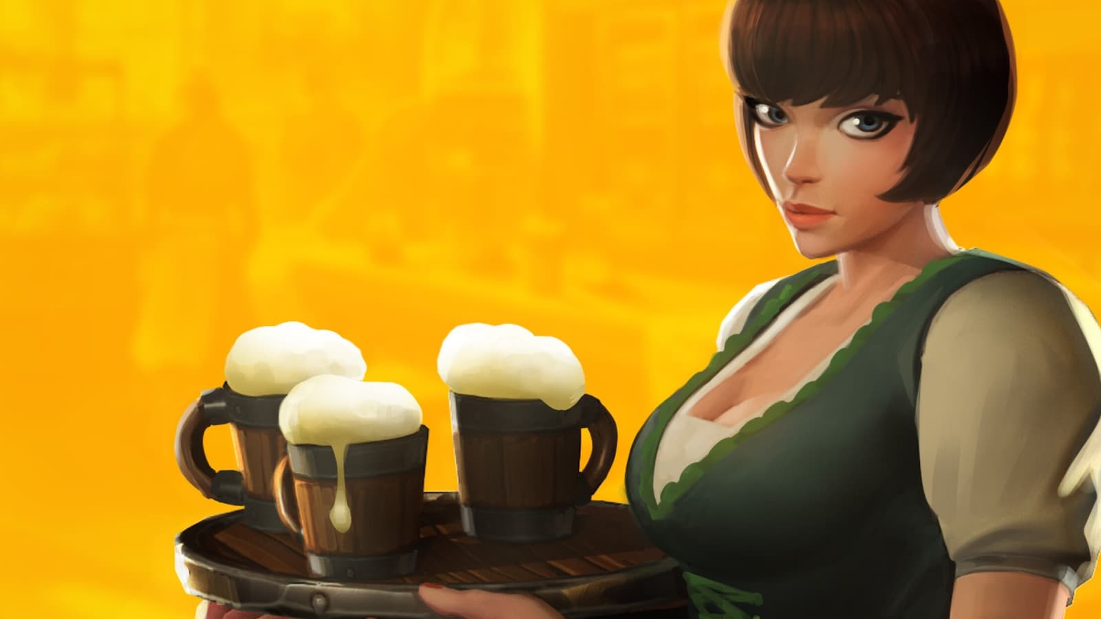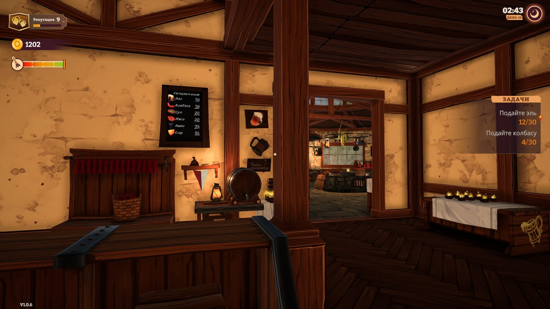Изначально в меню есть только эль. Процесс наливания эля в кружки выполнен в виде мини-игры. Можно просто налить напиток, или пойти на риск и добиться идеального результата – получишь дополнительную прибыль. Риск грозит последствиями, и неудача приводит к луже на полу и потере репутации.