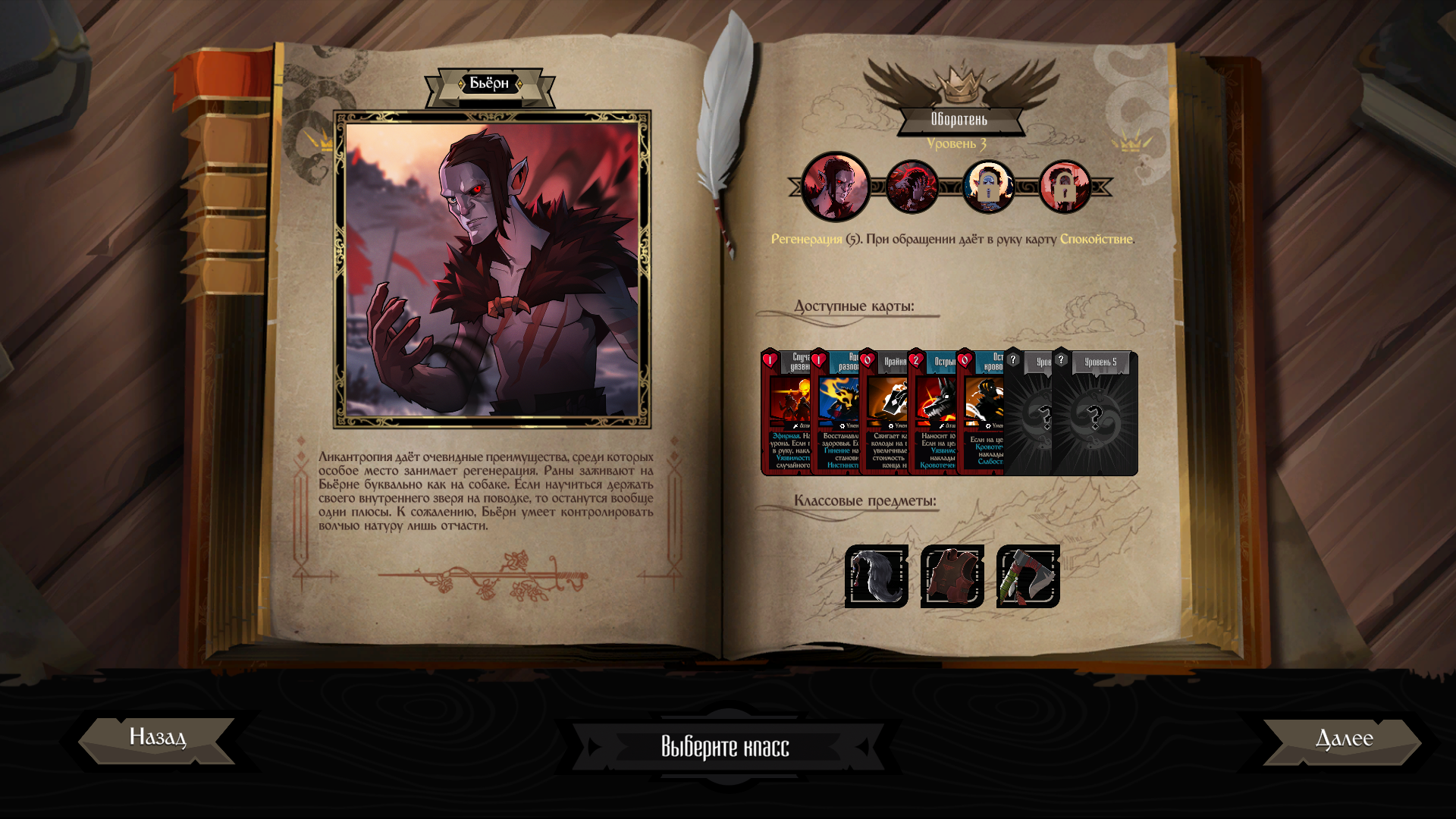 Завершив прохождение за Персиваля, мы получаем доступ к Бьёрну и его классам: «Оборотень», «Заблудший», «Друид лун», «Безумец». Для розыгрыша карт Бьёрн тратит собственное здоровье и выводит необходимость правильного менеджмента колоды на новый уровень, поскольку парнишка способен превращаться в оборотня, а его классы представляют собой стадии развития его проклятия.