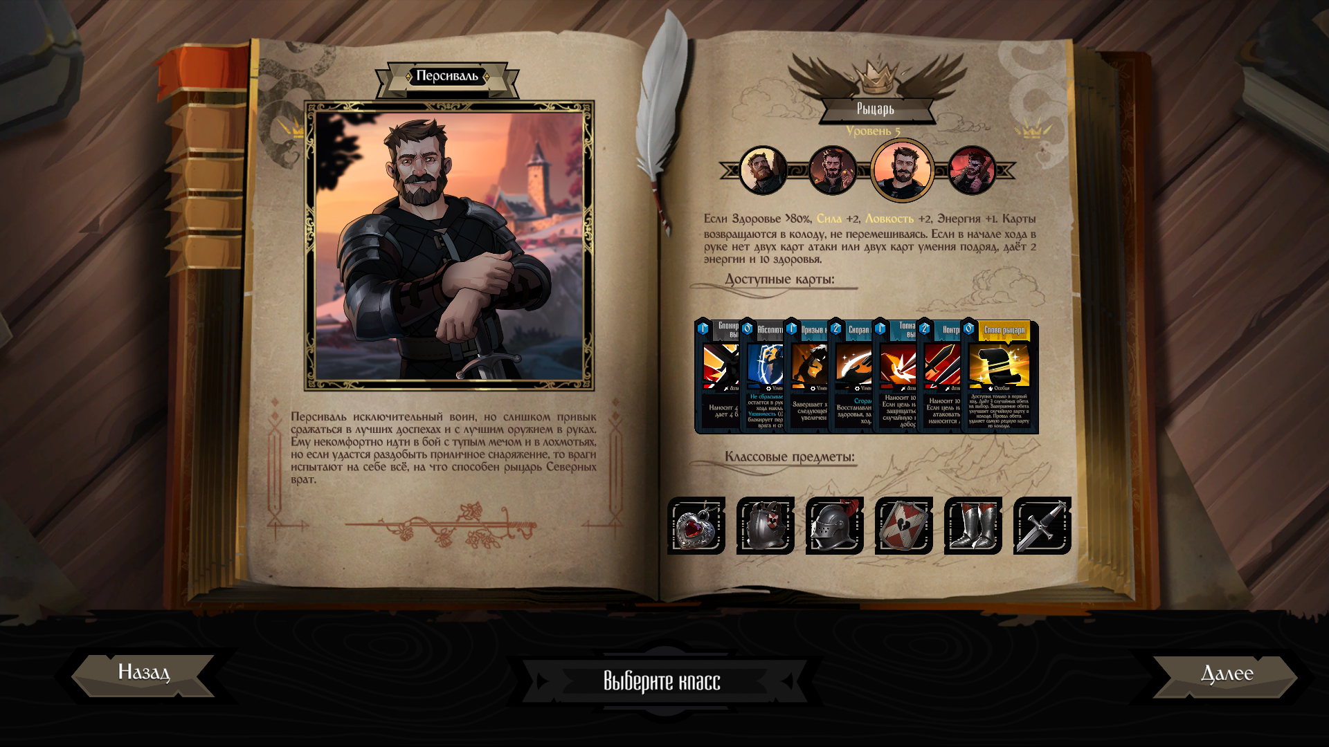 Персиваль открывает сюжетную кампанию с классом «Крепыш» — это классический воин с простыми в реализации защитными и атакующими картами. Он очень похож на «Латоносца» из Slay the Spire и является идеальным кандидатом для знакомства с базовыми механики.