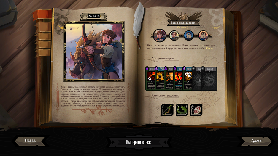 В последующем, участвуя в забегах, мы прокачиваем уровень и получаем доступ к другим классам: «Золотоискатель», «Рыцарь», «Ветеран». Классы имеют собственный набор уникальных карт, дополняющих стандартную колоду, и пассивный эффект, с которым стоит считаться при выборе снаряжения и построении колоды. Кроме того, каждый класс предлагает свои механики, который вносят разнообразие в игровой процесс. Например «Рыцарь» может пощадить противника, находящегося на последнем издыхании, и взять его в напарники.