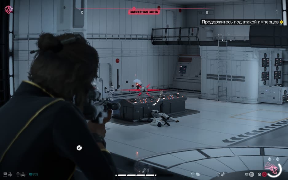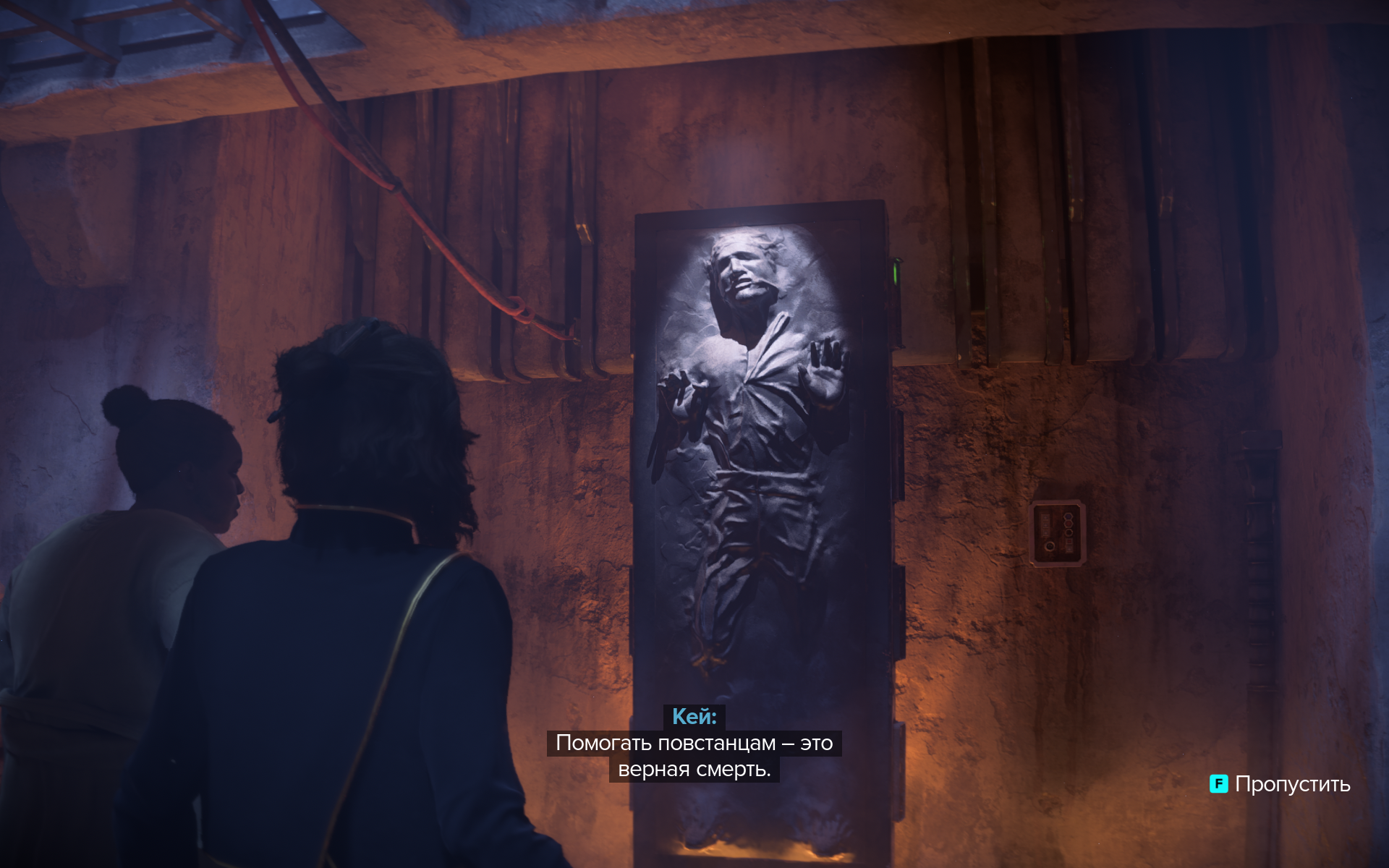 Взять то же вражеское оружие — почему нельзя было дать Кэй Вэсс таскать хотя бы одну винтовку за спиной? Да, пришлось бы найти её в мире, покупать к ней ресурсы или собирать их с врагов, прокачивать, складывать на спидер во время поездок — но это был бы выбор игрока. Сейчас же приходится даже во время паркура выбрасывать понравившееся оружие, потому что его нельзя поместить в инвентарь и использовать когда захочешь. Да, я понимаю логику: бластеры убойные даже на максимальной сложности и с ними бы прокачка личного оружия Кэй потеряла бы смысл, но продумать органичную смену вооружения всё же стоило.
