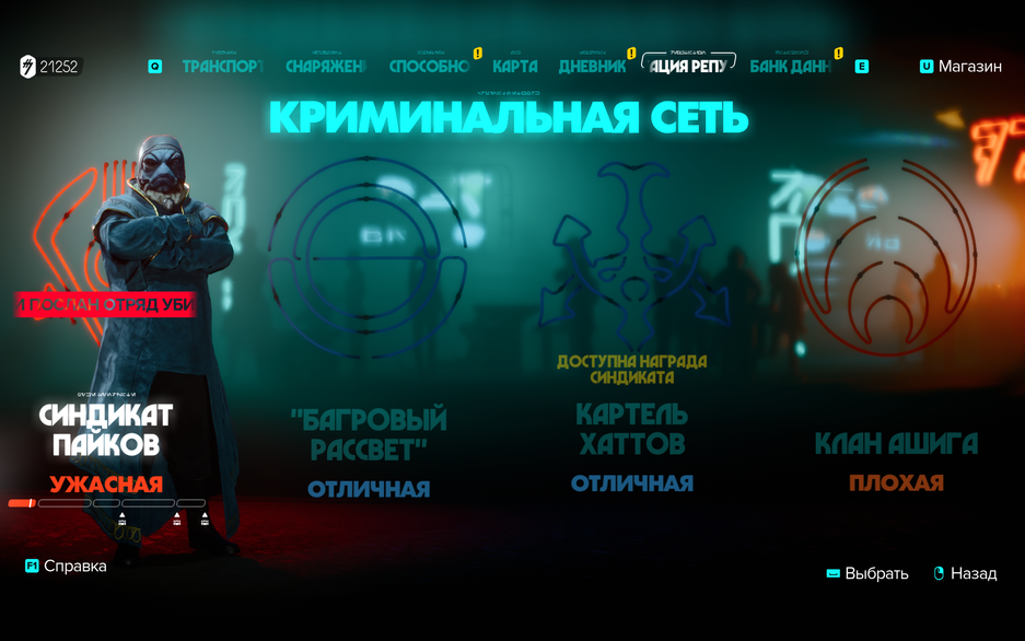 Хорошие или отличные отношения с синдикатом открывают доступ к высококлассному снаряжению, прибыльным заданиям-контрактам нескольких видов — проникновение, контрабанда, воровство, бой, — и возможности гулять по территории синдиката без стеснения. Ну, кроме запрещённых зон, конечно, где и находится самая вкусная добыча. Туда уже придётся проникать скрытно, не привлекая внимания и не попадаясь стражникам — иначе выкинут из района и отношения, так долго строившиеся, пошатнутся.