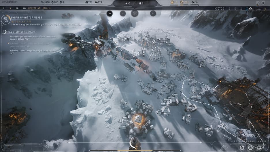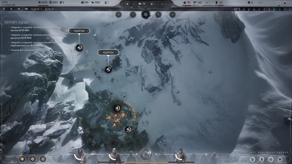 Я не играл в Frostpunk 1, а потому не имел представления о механиках игры. И уже в самом начале пришлось столкнуться с разочарованием, поскольку в обучении игра плохо справлялась с, собственно, обучением. Необходимо помочь группе кочевников пережить холод, игра учит строить дома и добывающие производства — чтобы люди не заболевали и не умирали от холода, и на заводах было кому работать. Однако она не упоминает о том, что лёд необходимо пробивать сразу и много. И что зданий нужно построить больше, чем предлагается игрой. В противном случае пролог закончится поражением.