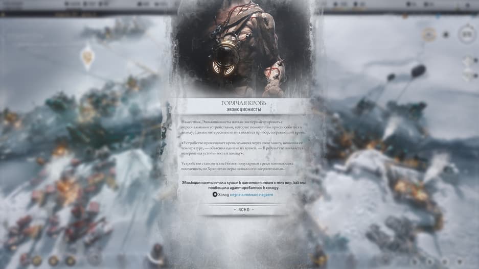 Во время прохождения нужно заниматься исследованиями. Среди них есть крайне полезные, которые дают бонусы к отоплению города. Другие позволяют возводить новые пристройки. Но и тут возникает проблема с балансом, поскольку предлагаемые группировками проекты обладают минимальным отличием. Единственный смысл выбора сводится к улучшению отношений с определённой группировкой.