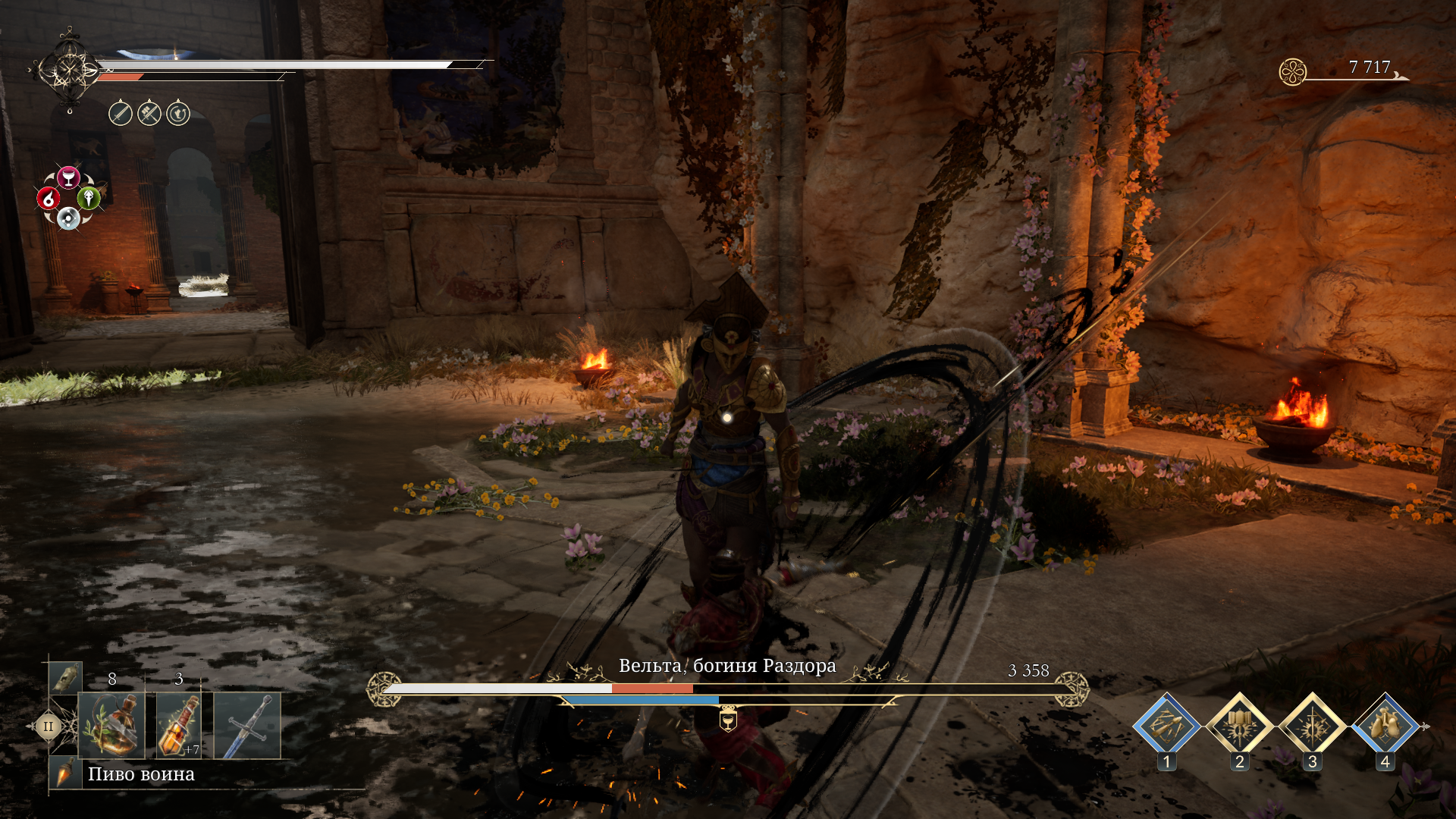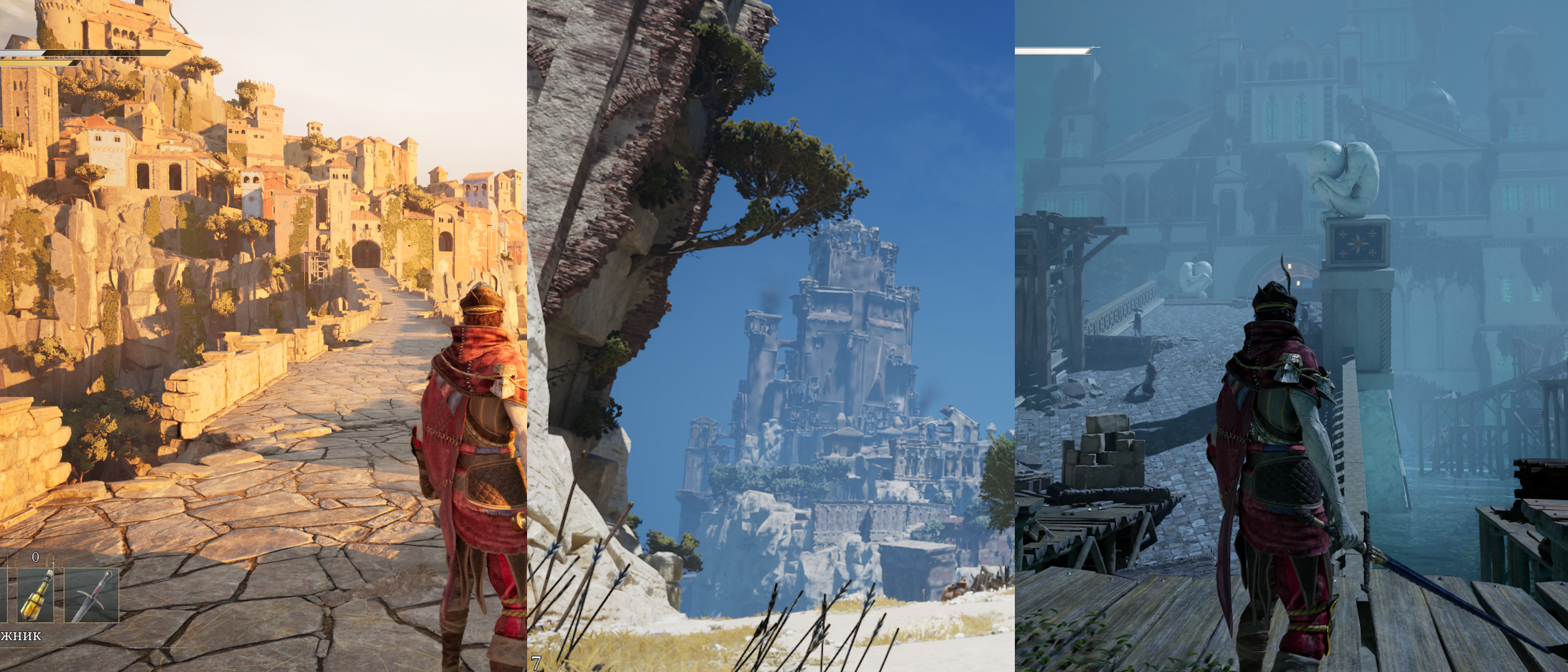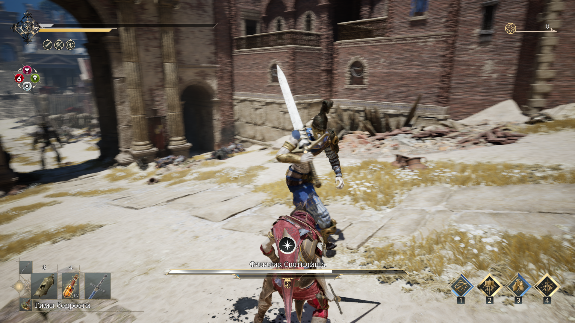 И говоря о билдах, стоит упомянуть о комбинировании персонажей. В Enotria можно сделать сразу 3 готовых сборки, между которыми можно переключаться даже во время боя. Каждая из сборок может выполнять те или иные боевые задачи, и на словах это звучит довольно интересно. Тем более, что в том же Genshin Impact и ZZZ реализована механика комбо-приёмов с переключением персонажей. Здесь же эта возможность выглядит как костыль…