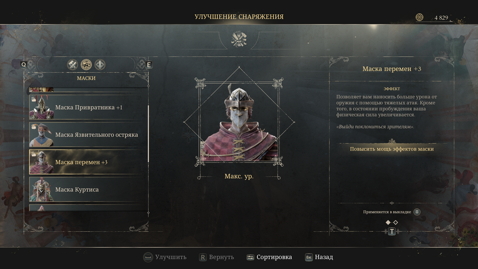 У всех вышеупомянутых элементов прокачки есть одна довольно интересная особенность. Качать можно не только персонажа, но и его снаряжение: маски, оружие и даже заклинания! Нужно найти лишь ресурсы для прокачки и иметь нужное количество валюты.