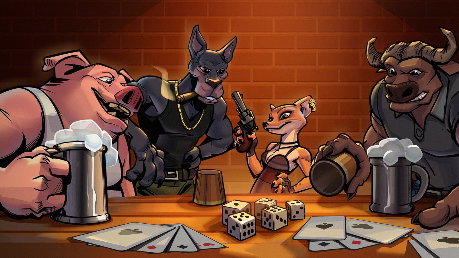 Действие игры разворачивается в баре. Там играют четыре доступных персонажа, чей дизайн кажется до боли знакомым: Буйвол из Zootopia; Свинья из Beyond Good and Evil; Лиса из The Bad Guys. Могу поклясться, что видел где-то и пса, но никак не могу вспомнить «где». Будем надеяться, что разработчики в достаточной степени изменили внешность персонажей – в противном случае к игре могут возникнуть вопросы по авторским правам. Герои же выделяются только внешностью, и не дают преимуществ во время игры.
