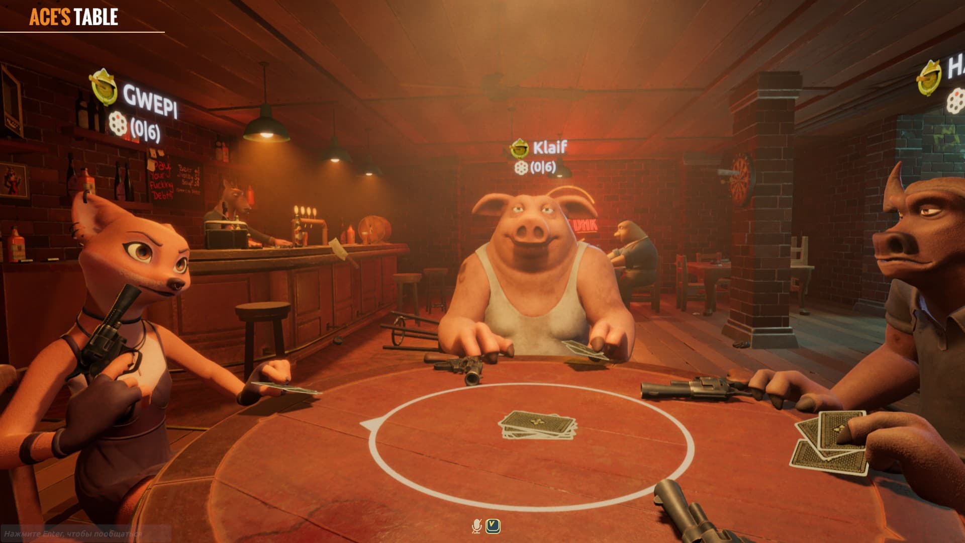 Liar's Bar является подборкой игр, где ставки максимально высоки. Выберите занятие по вкусу, блефуйте и читайте противников изо всех сил — ведь наказанием за неудачу является смерть за игральным столом.