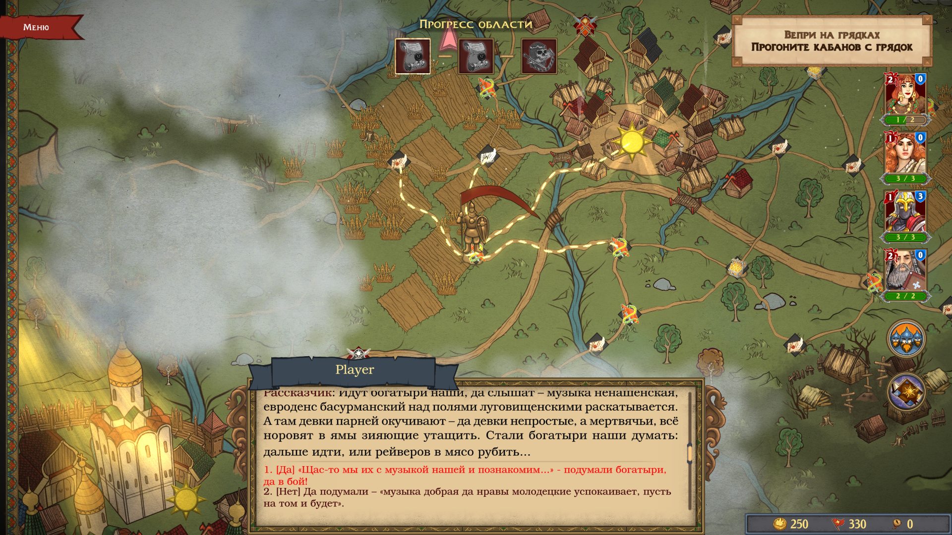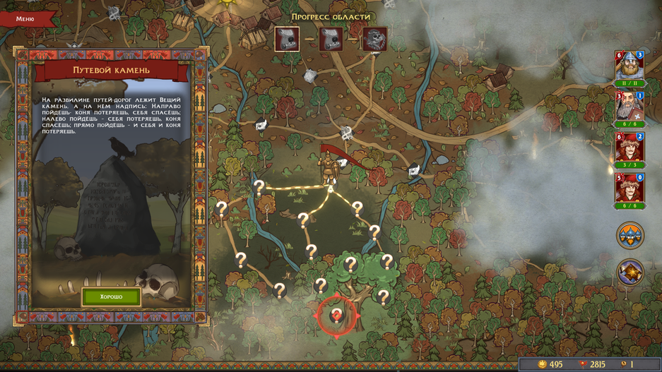 В каждом акте имеются одни и те же активности: сражения, сундуки, путевые камни и события. С первыми тремя всё понятно — сражаемся, получаем награды и все хорошо. Но вот события в игре вызывают смешанные чувства: иногда они есть, а иногда их просто нет. Представьте: вы видите на карте пометку «интересное событие», но придя на место, в вас кидают пару строк текста — и всё. Как я писал выше, встречаются забавные экземпляры, но хочется-то большего!