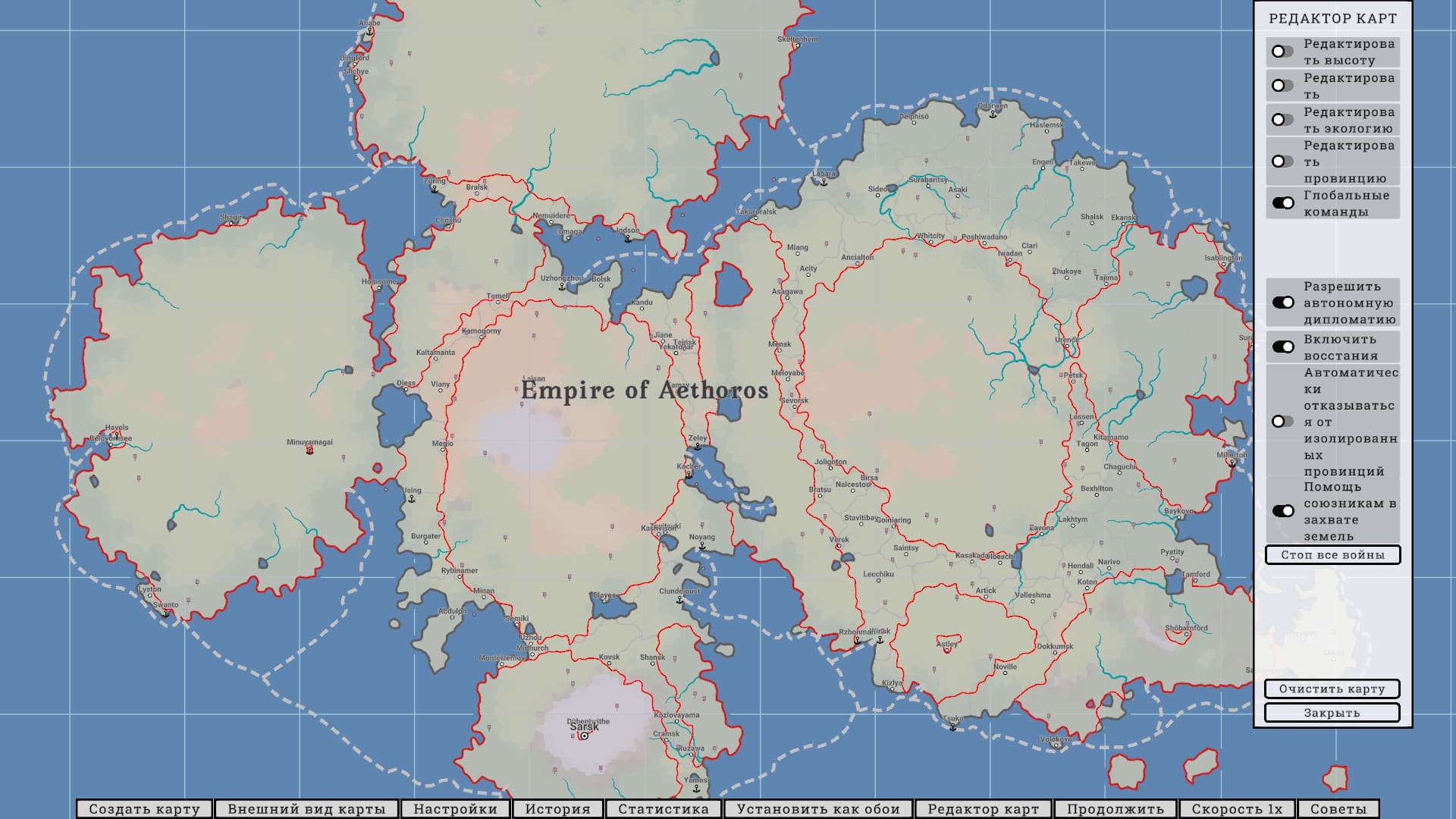 Дальше – больше! Редактор карт удобен в создании континентов и островов. На них вполне можно расположить империи и королевства. Однако с более тонкой работой возникают проблемы. Настоящим кошмаром становится разделение земель; возведение гор; установка водных преград; адекватное разделение государств границей; адекватная работа с городами. У карт отсутствует подземный слой – все события происходят на поверхности.