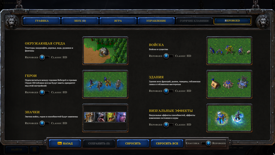 Кроме того, появилась модульная настройка графики. Теперь доступен выбор между классической графикой, либо Reforged, а в меню Reforged добавлена опция Classic HD, которая предлагает улучшенный вариант оригинальной графики. В меню теперь отдельно выбирается внешний вид зданий, войск, отображение визуальных эффектов, окружения, героев и иконок.